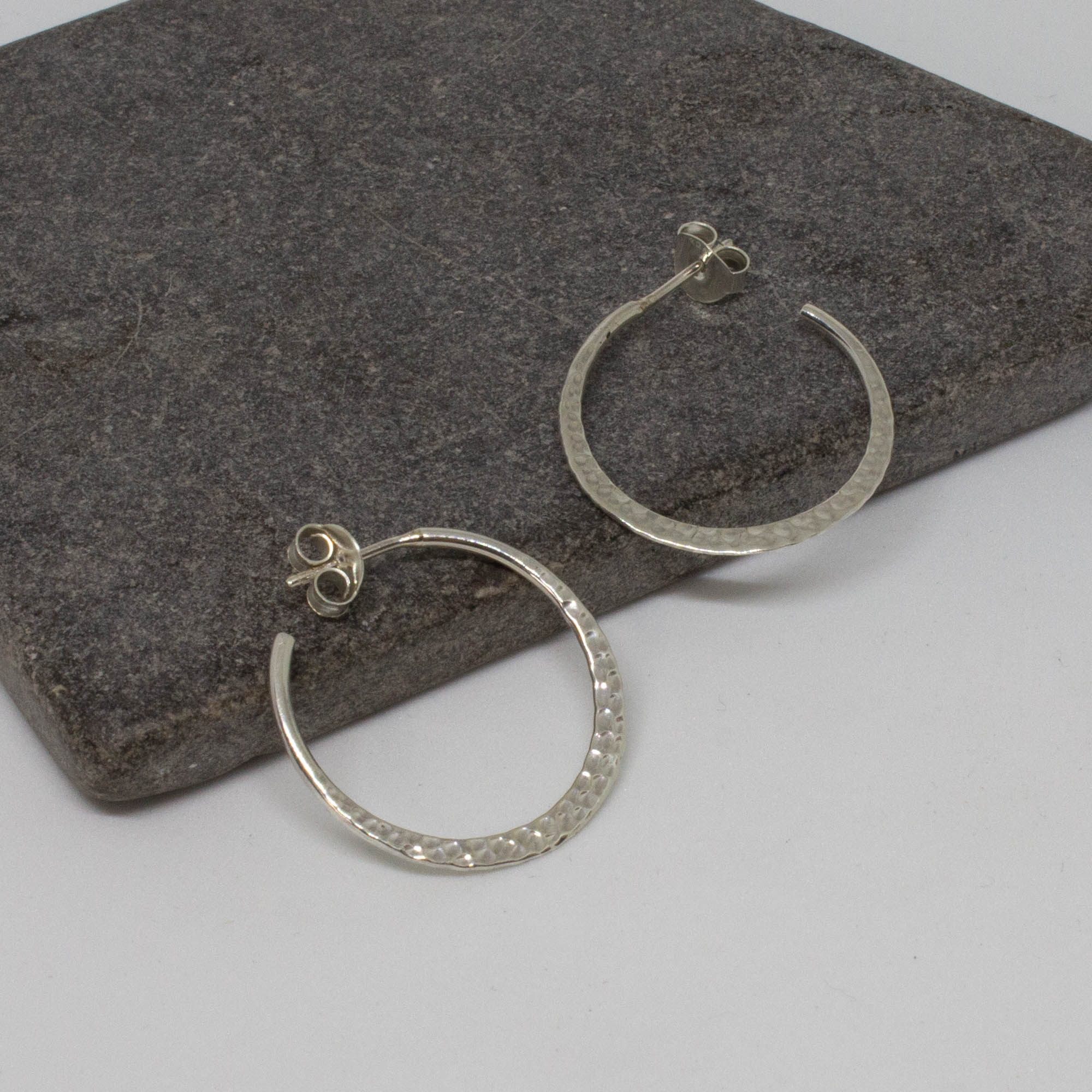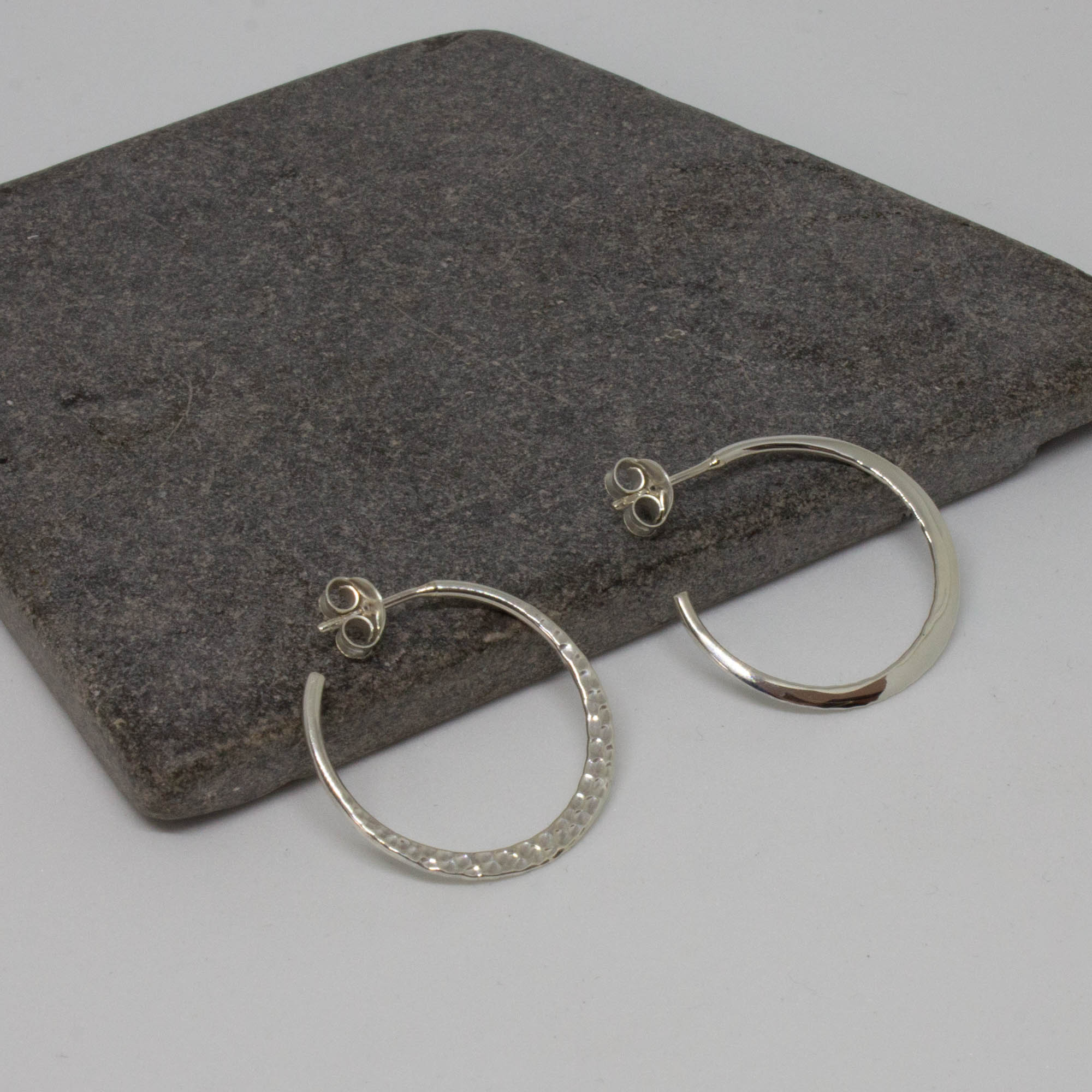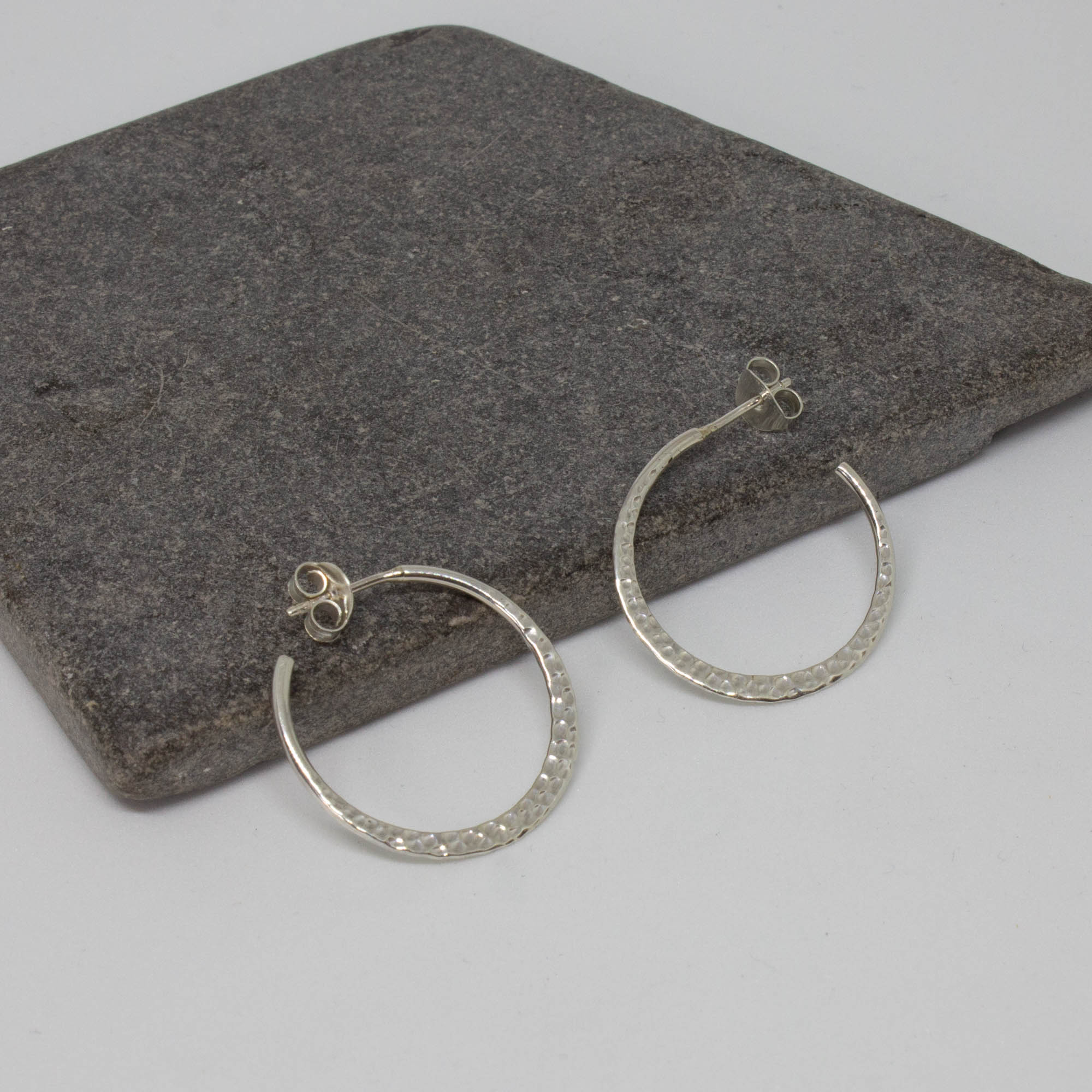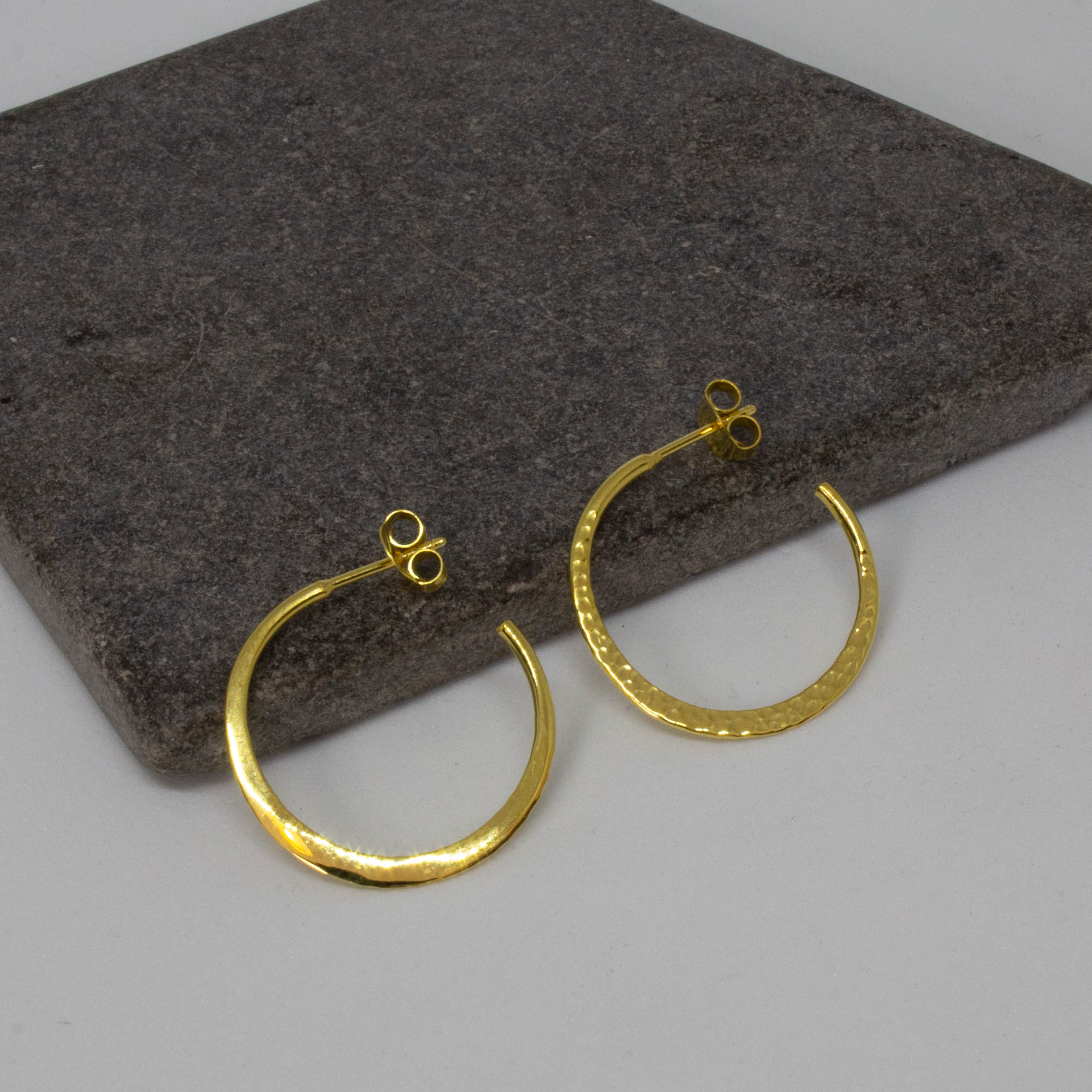 These minimalist 'half hoops' are handmade in sterling silver, with the option of 18k gold plating. With a hammered finish and a stud fitting.
