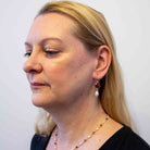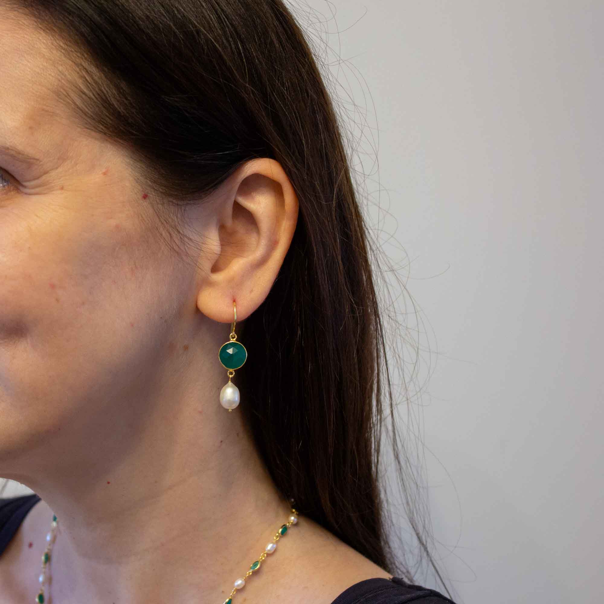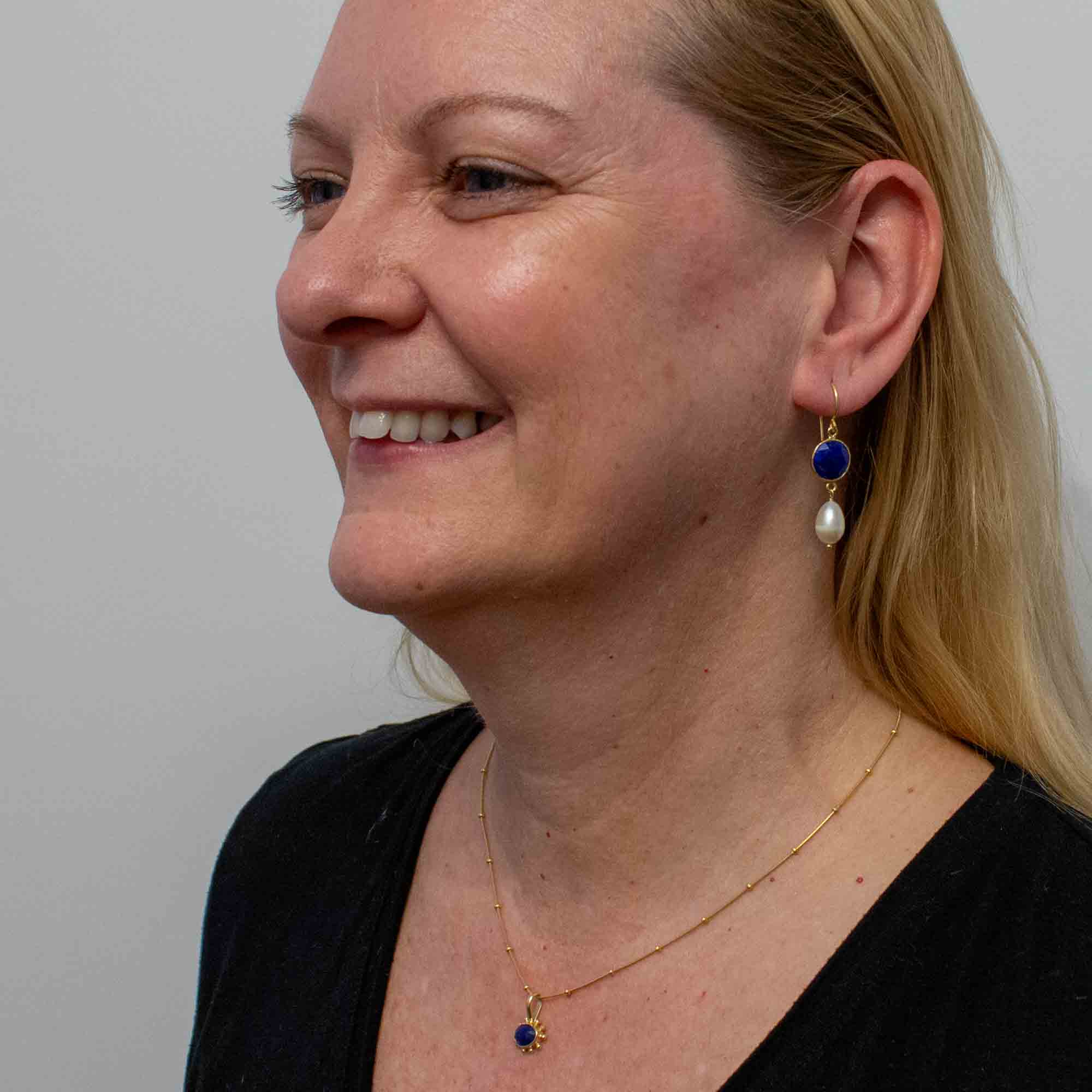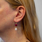 Our gemstone and pearl Lina earrings feature a natural white freshwater pearl suspended round faceted gemstone - choose from Ruby or Lapis Lazuli, with a simple 18k gold vermeil setting and hook fitting