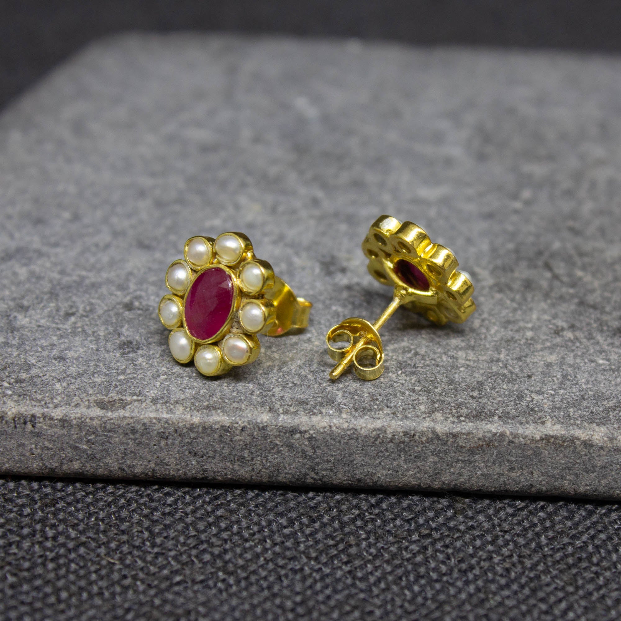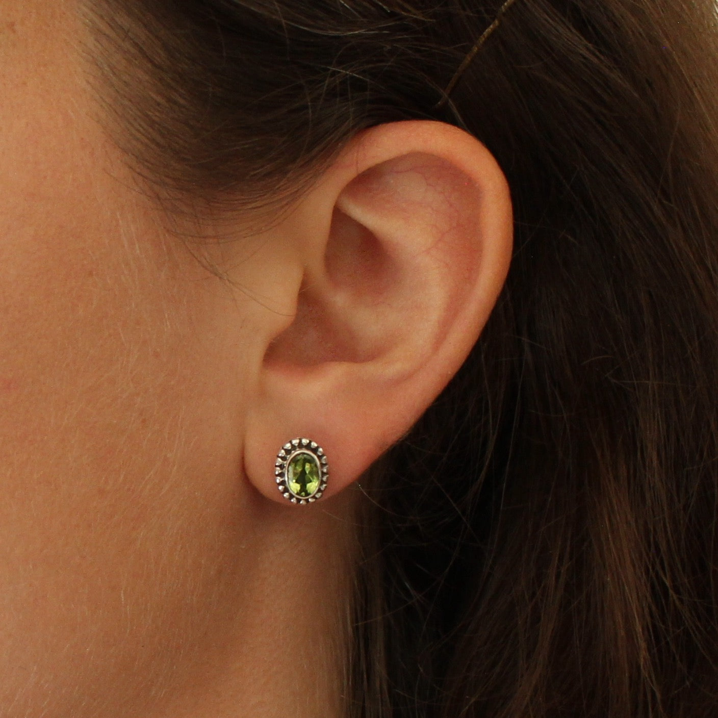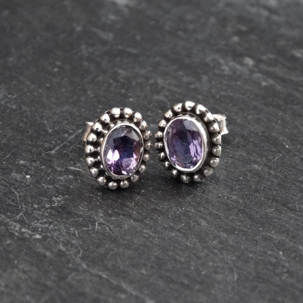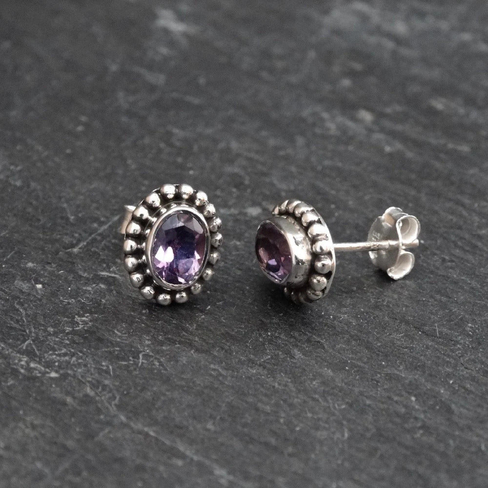 Gemstone and Sterling Silver Detail Oval Stud Earrings