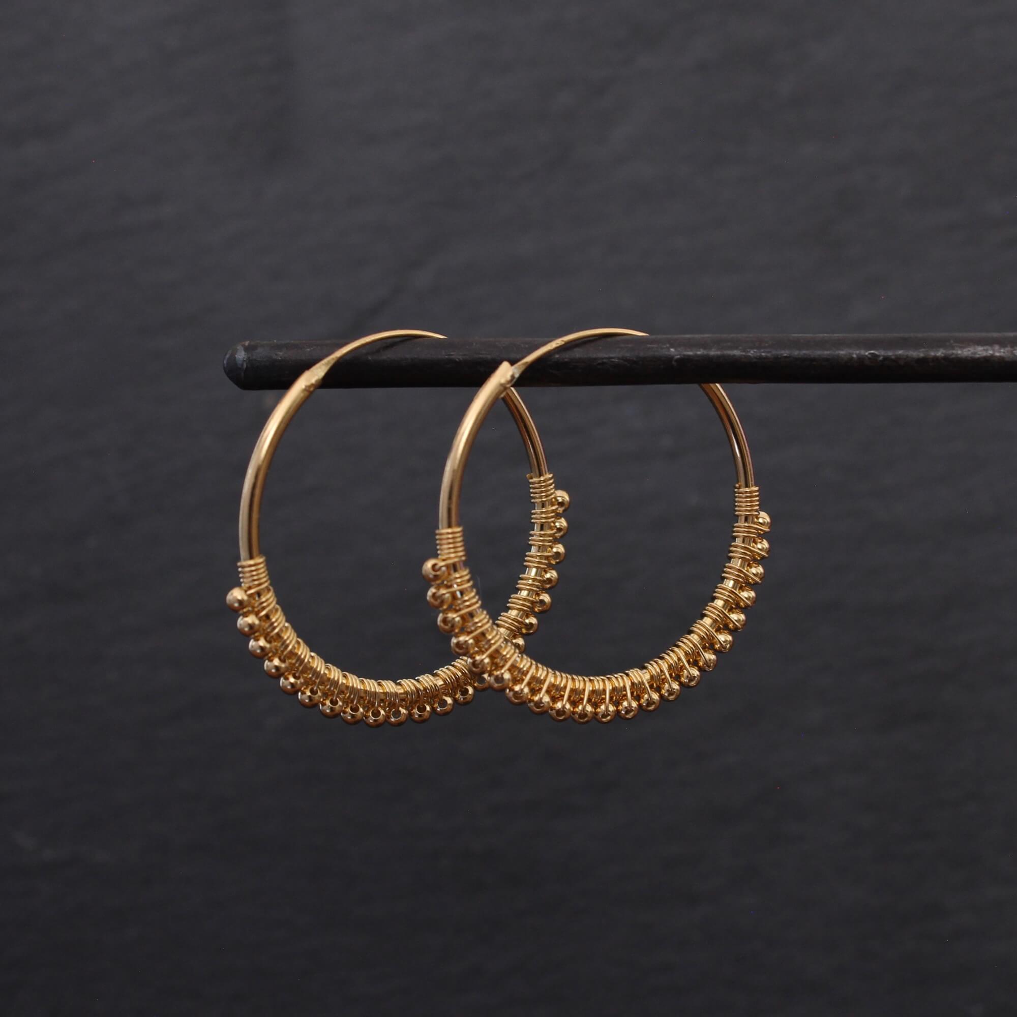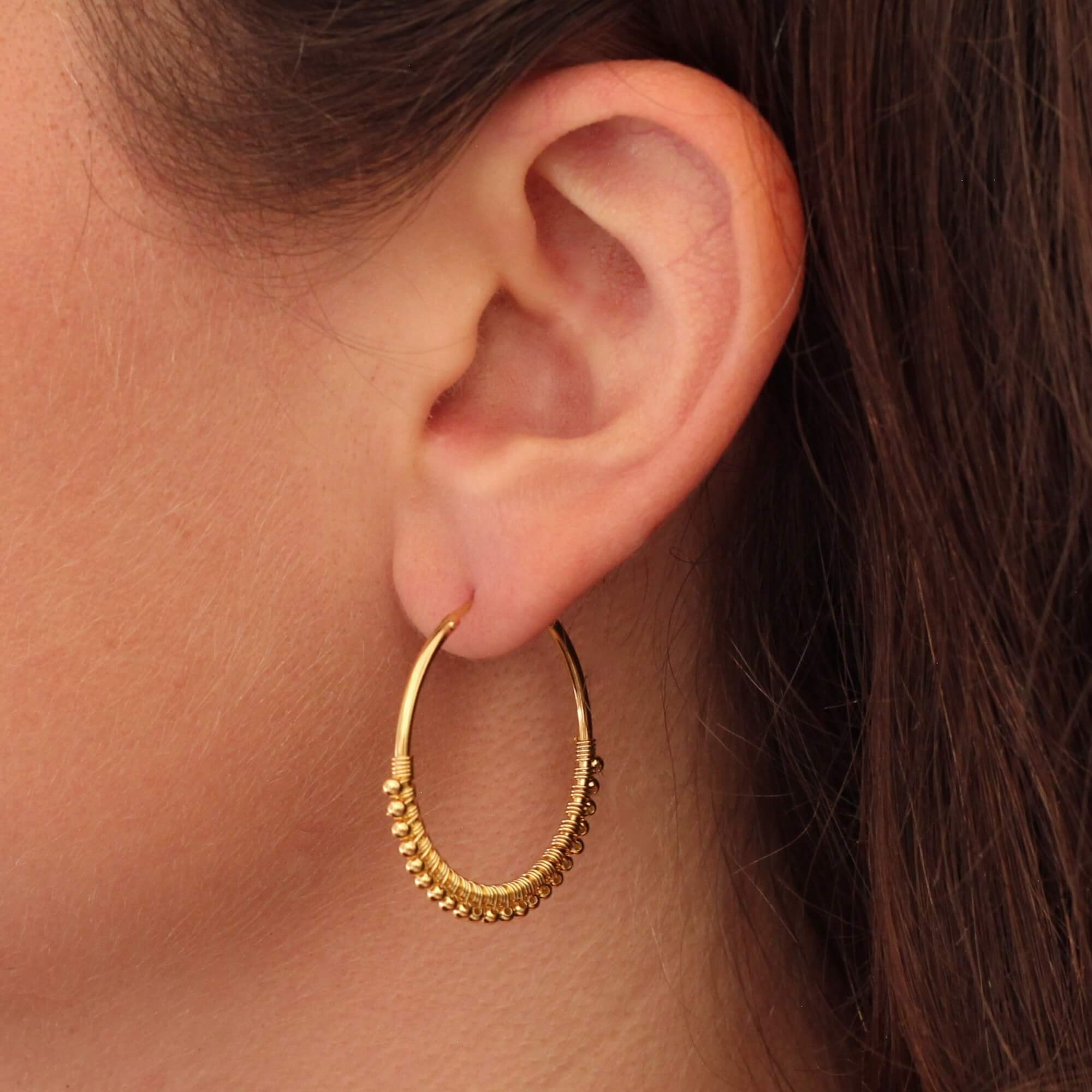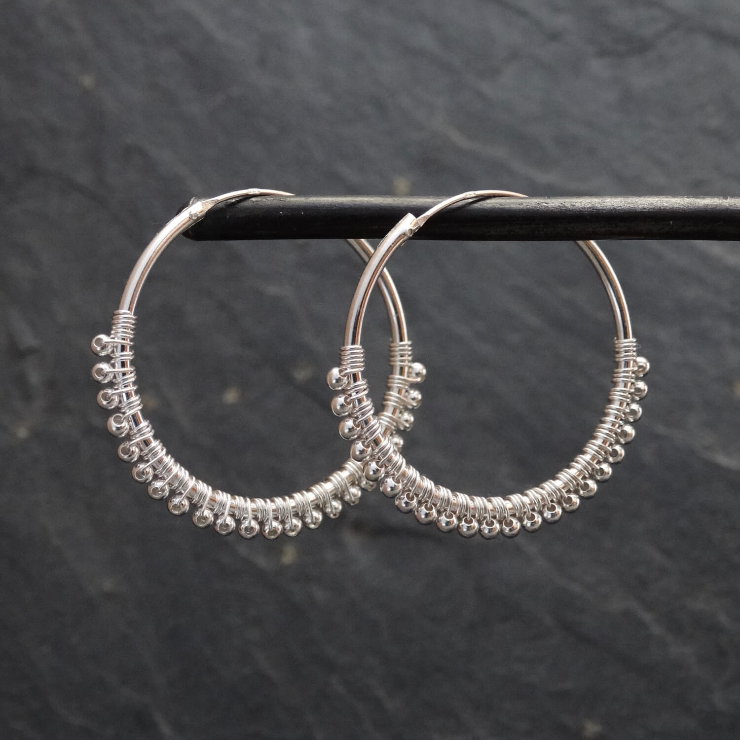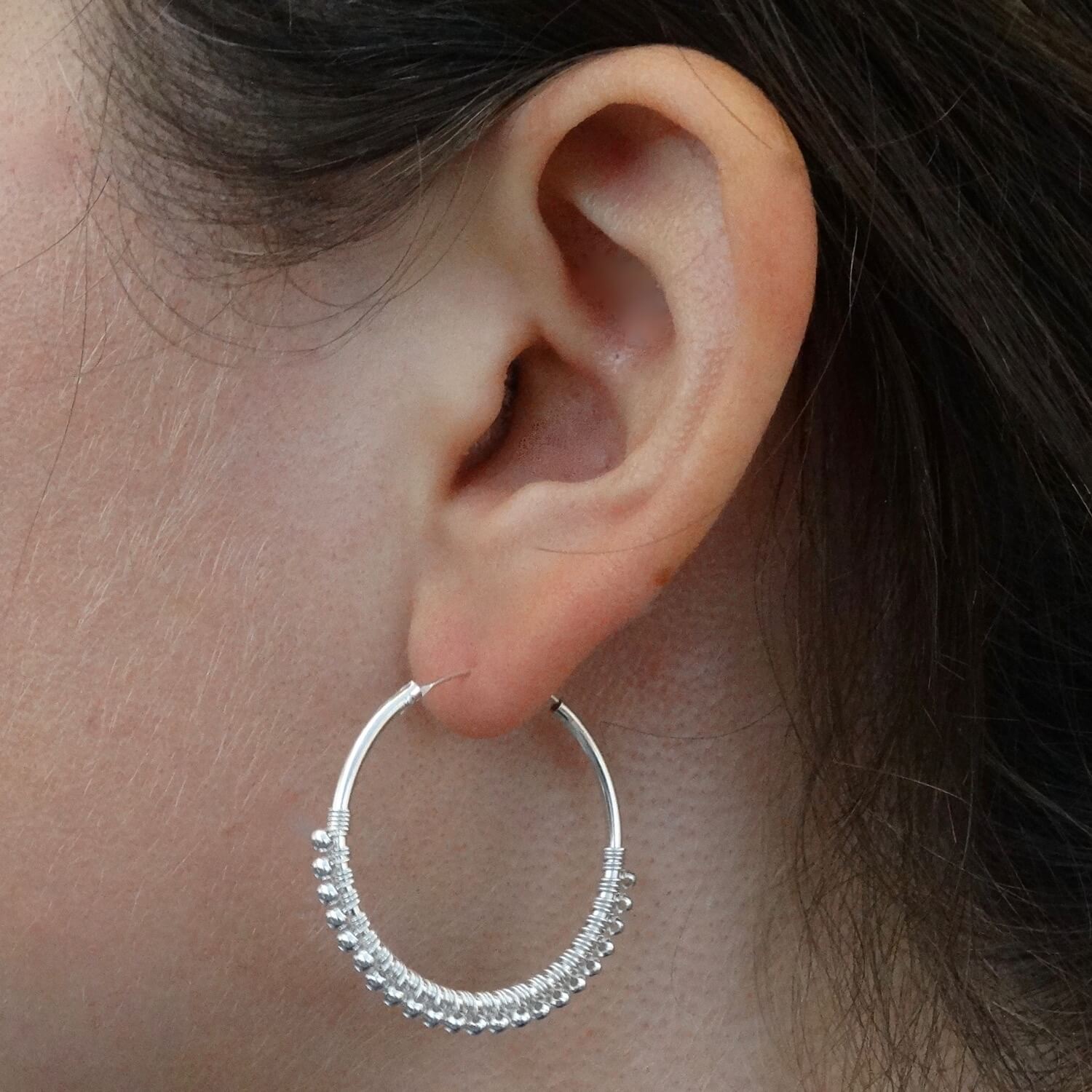 Medium sized hoop earrings with silver beaded and wirework detail and a hinged fitting.