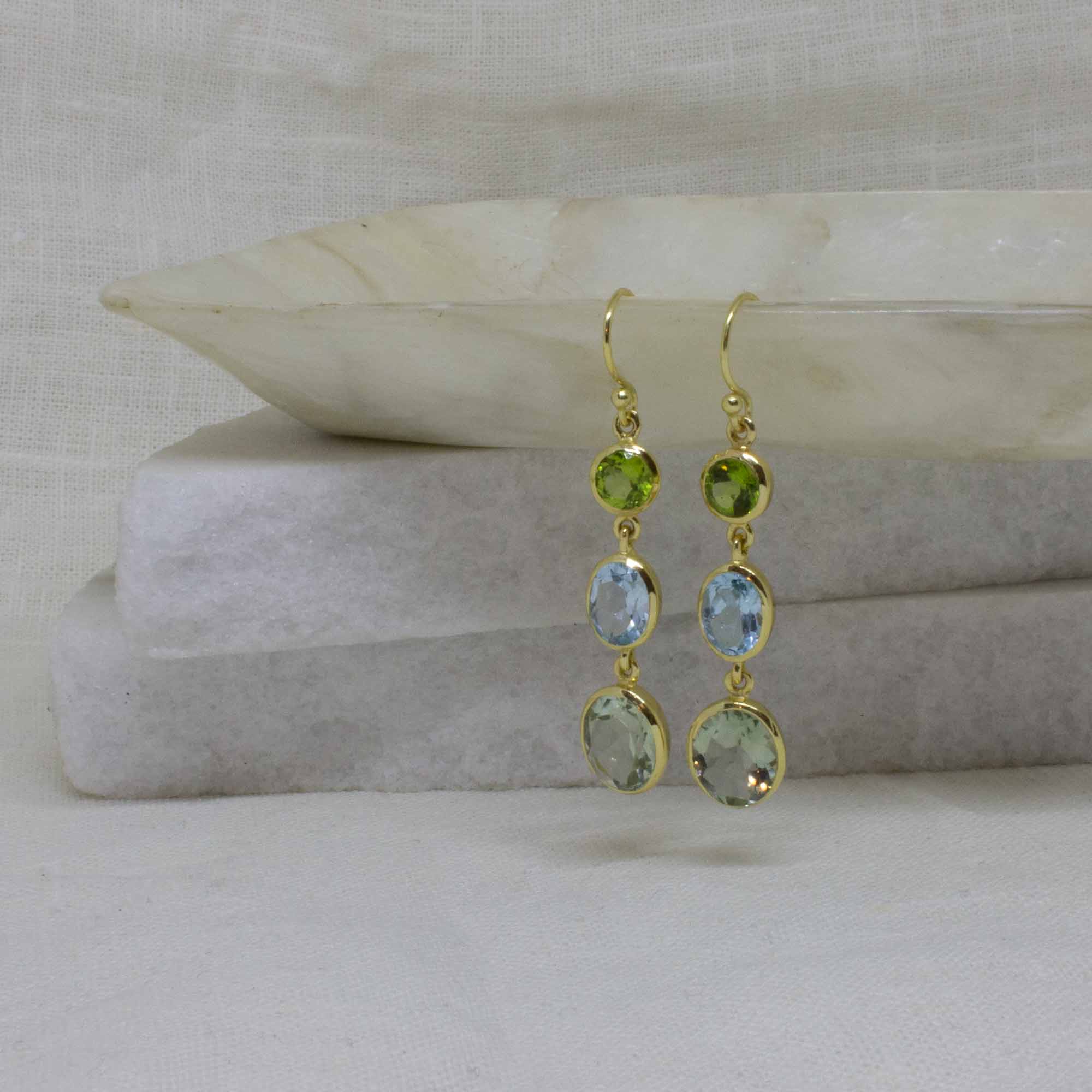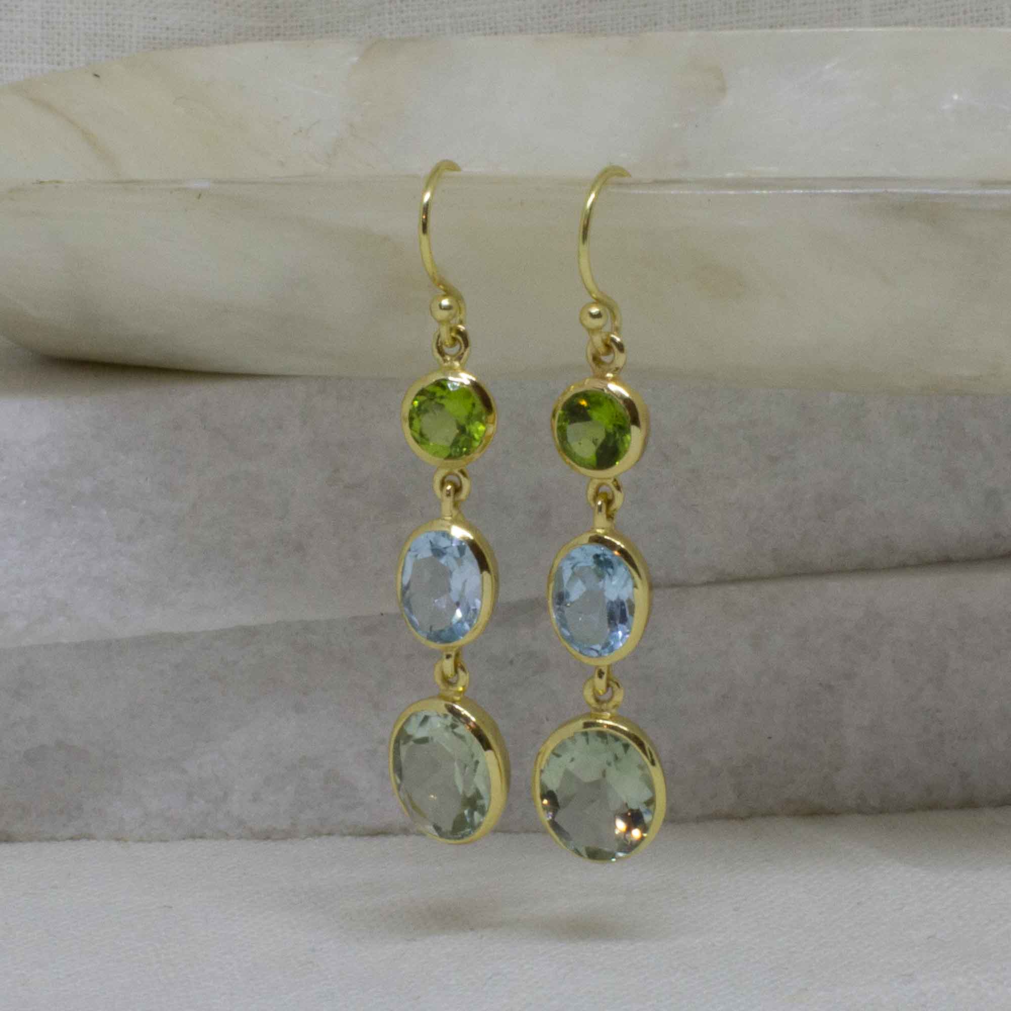 Long gemstone dangle earrings, comprising of round peridot and oval blue topaz and green amethyst gemstones. In a 18k gold vermeil setting with a simple hook fitting.