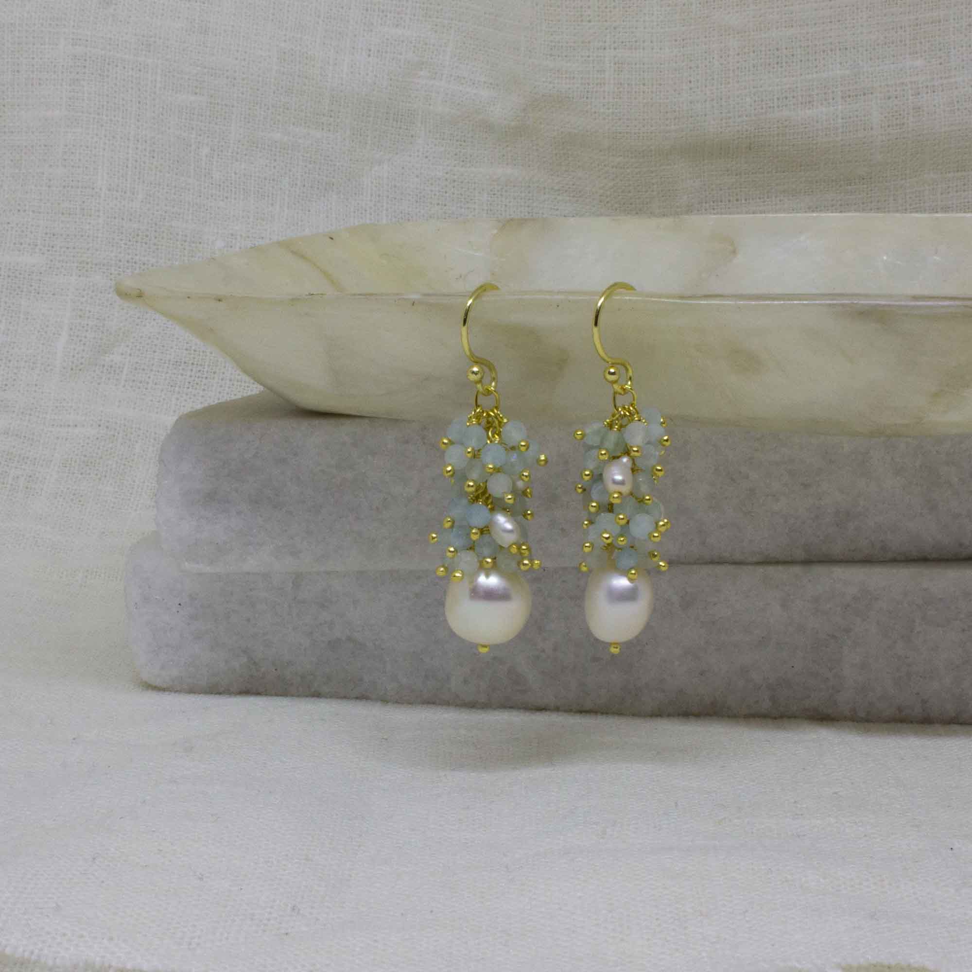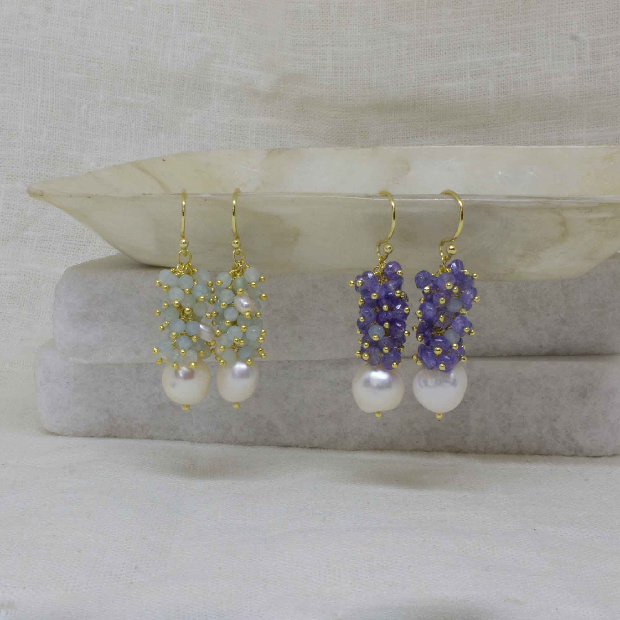 Pearl and gemstone cluster earrings, handmade in 18k gold plated silver with simple hook fittings.