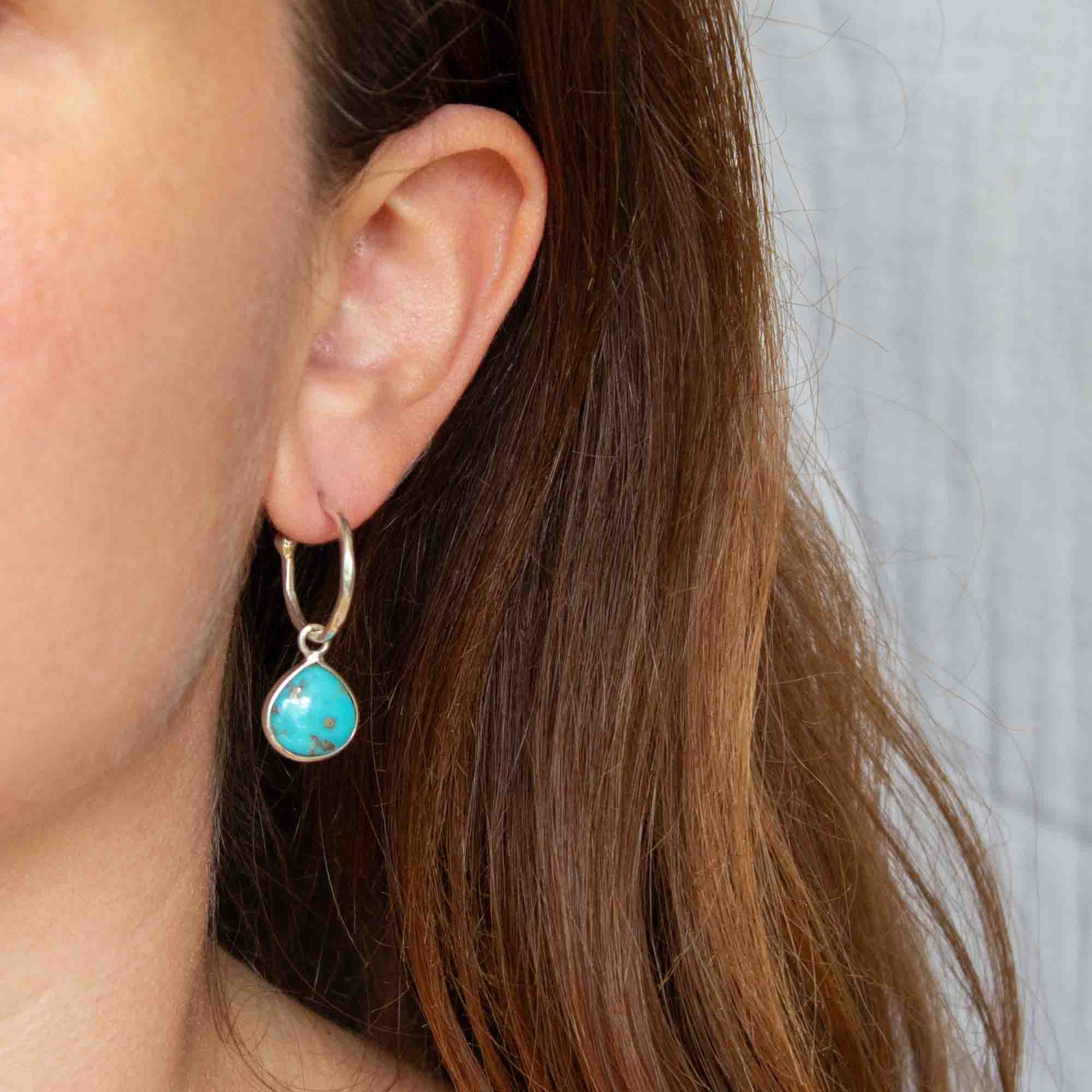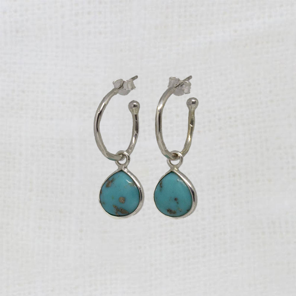 Simple hoop earrings with a subtle hammered texture finish and stud fitting, complete with teardrop natural turquoise gemstone charms.