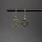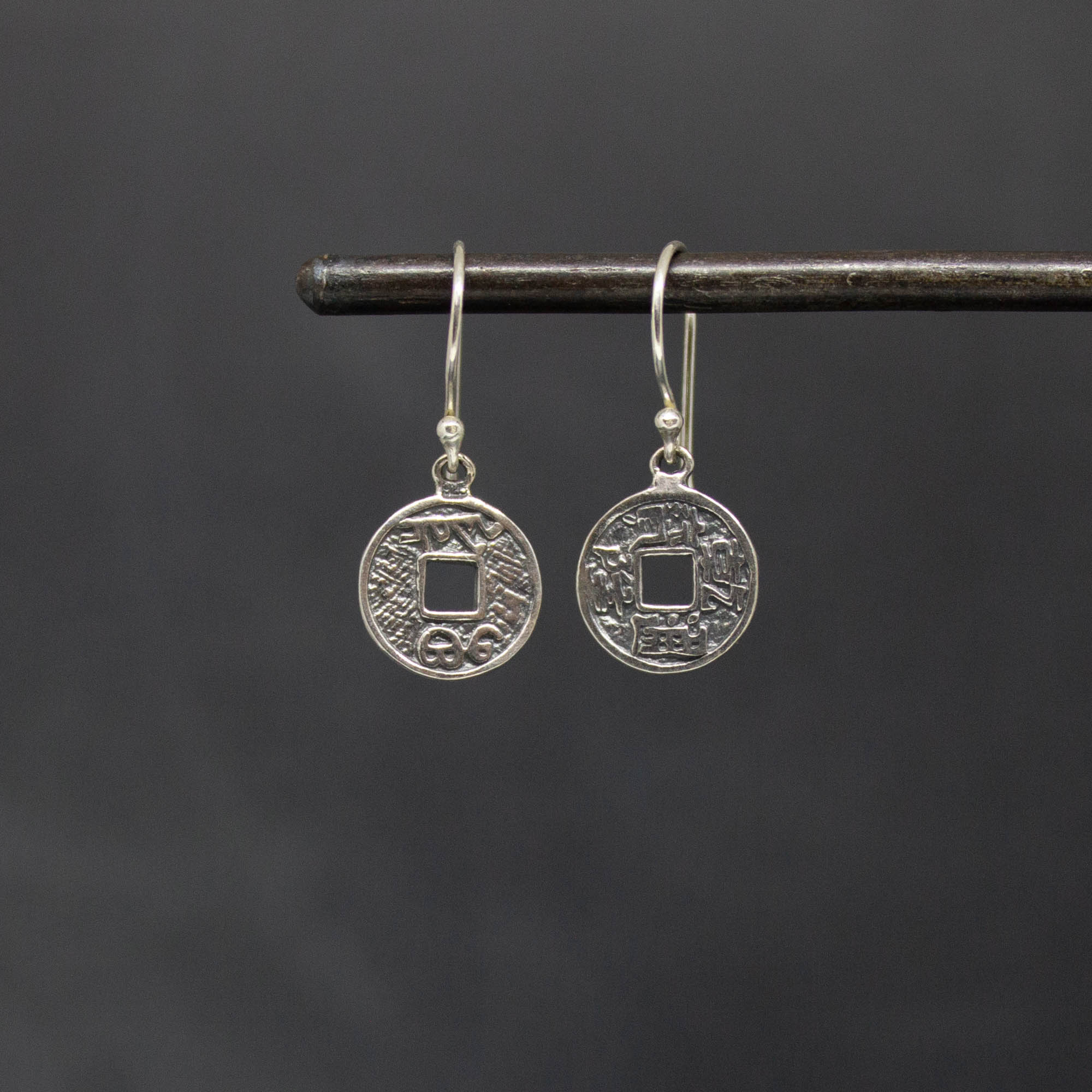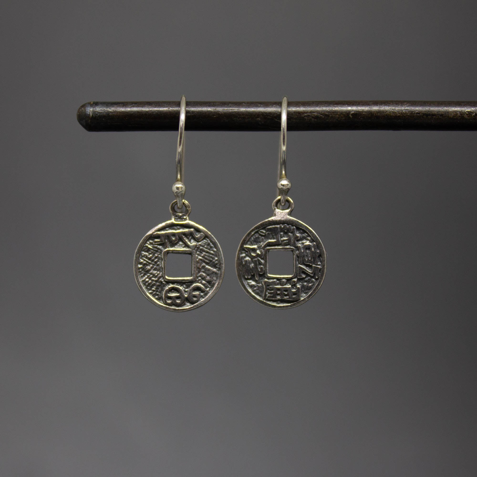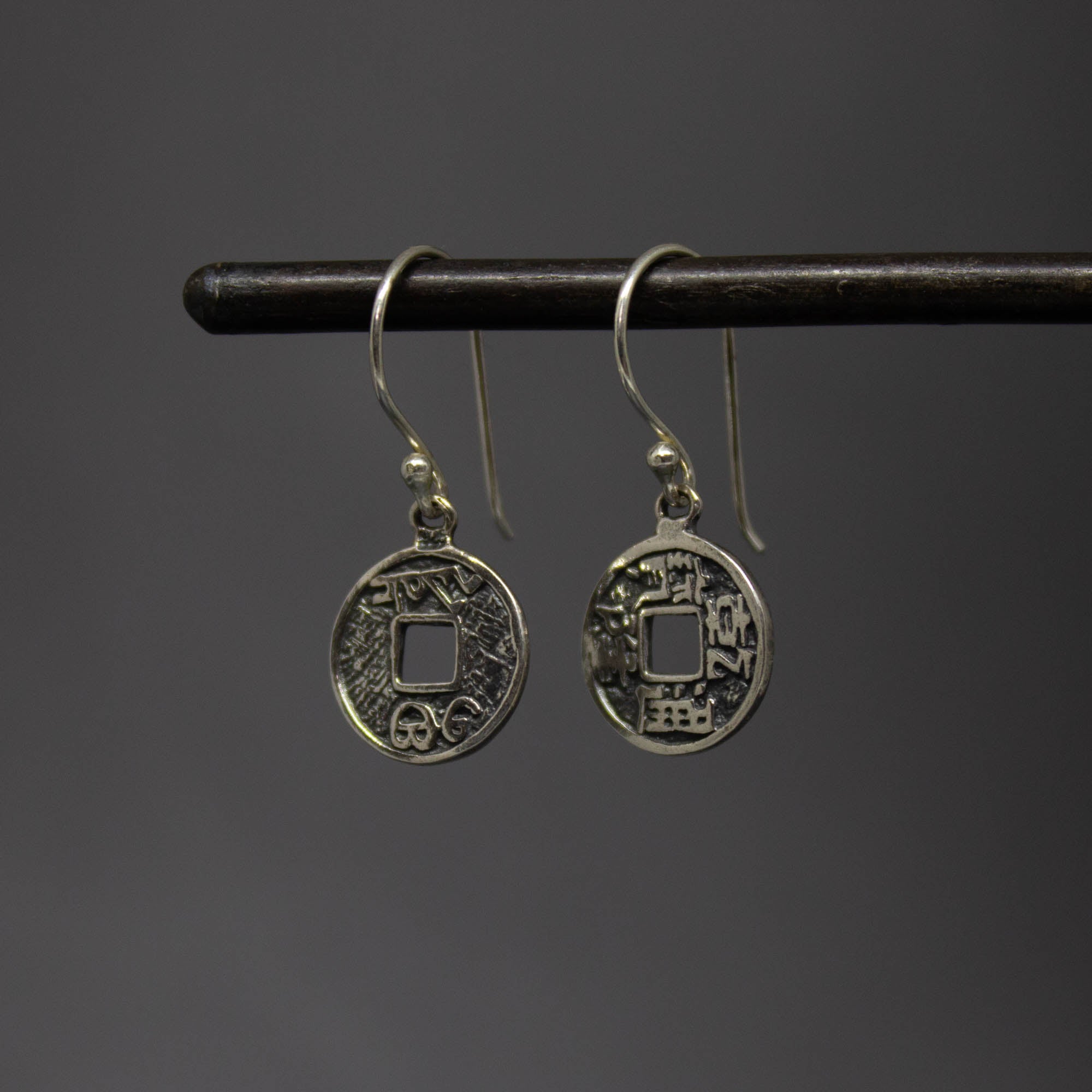 Oxidised sterling silver I Ching coin drop earrings.