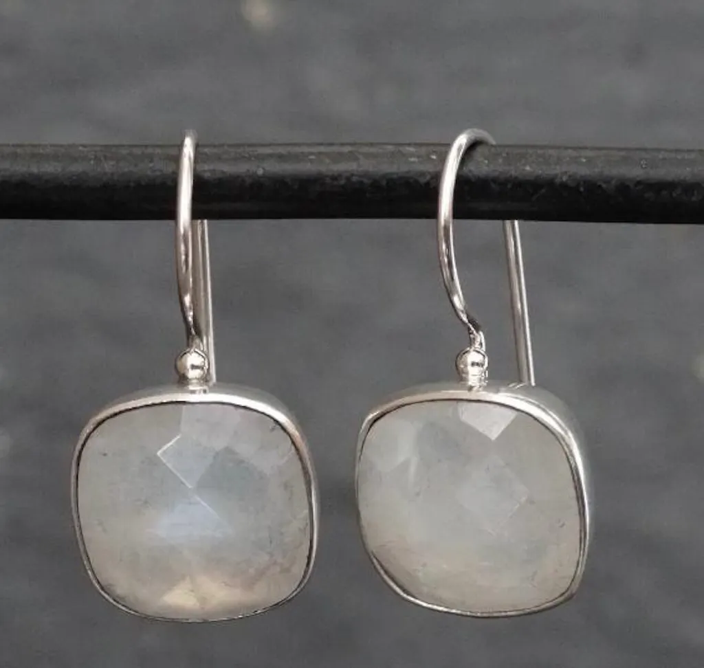 Sterling silver drop earrings embellished with faceted 'cushion cut' rainbow moonstone stones.