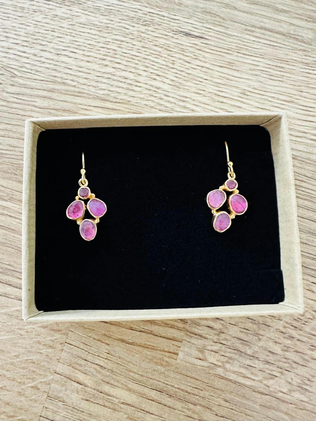 These stunning drop earrings feature natural pink tourmalines set in 18k gold vermeil. Three raw tourmaline gemstones and one faceted pink tourmaline in a simple gold plated silver setting, with a hook fitting.