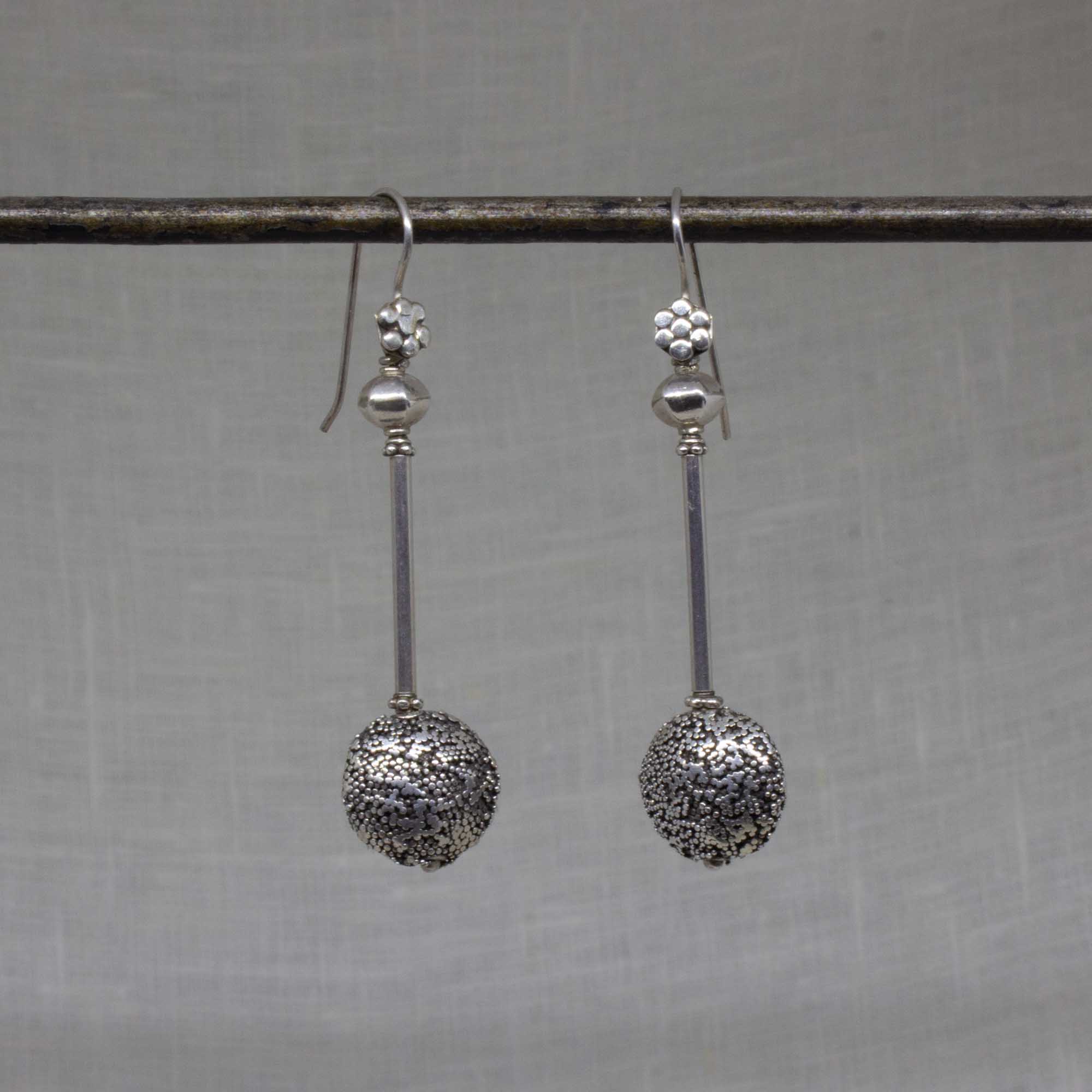 Elegant long drop earrings, handmade in sterling silver with granulation detail and a hook fitting.