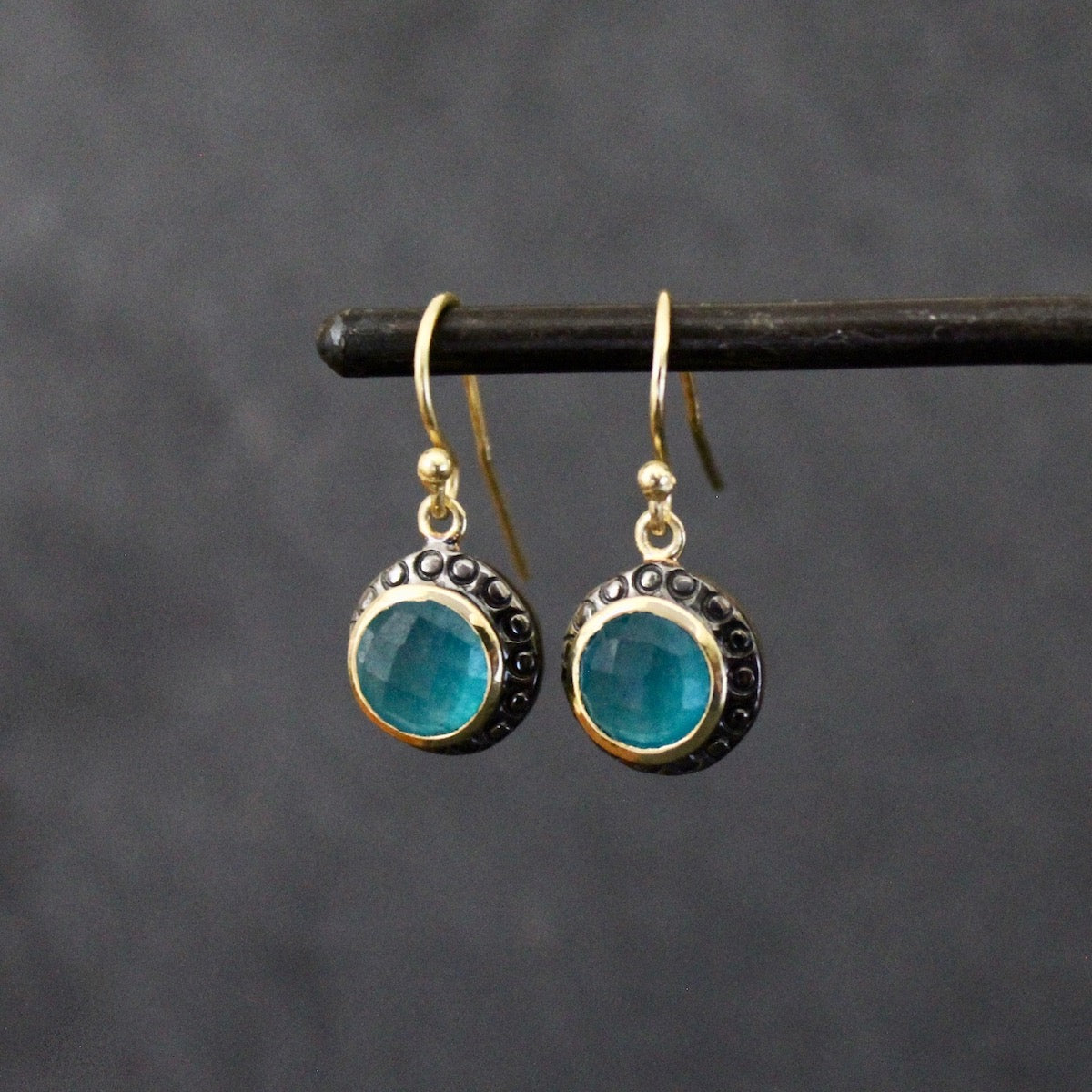 Faceted turquoise quartz in a gold vermeil and black rhodium textured setting, with a hook fitting.