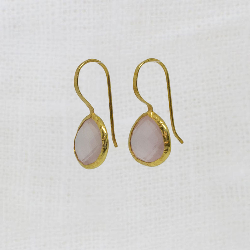 Stunning faceted pale pink rose quartz gemstones set in a textured gold vermeil setting with a hook fitting.