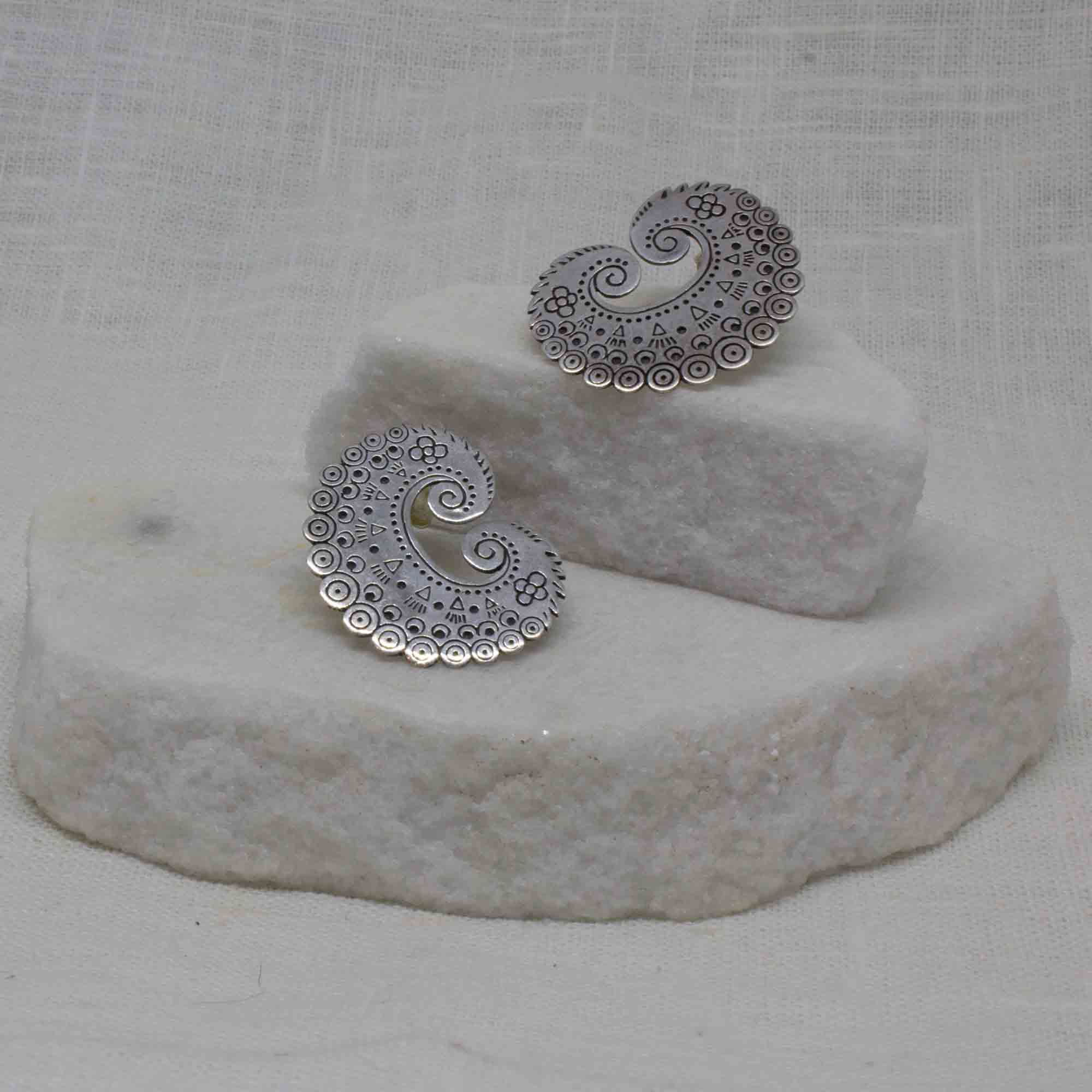 Unique sterling silver large stud earrings, with scalloped edges and engraved paisley pattern detail. Post and butterfly fitting.