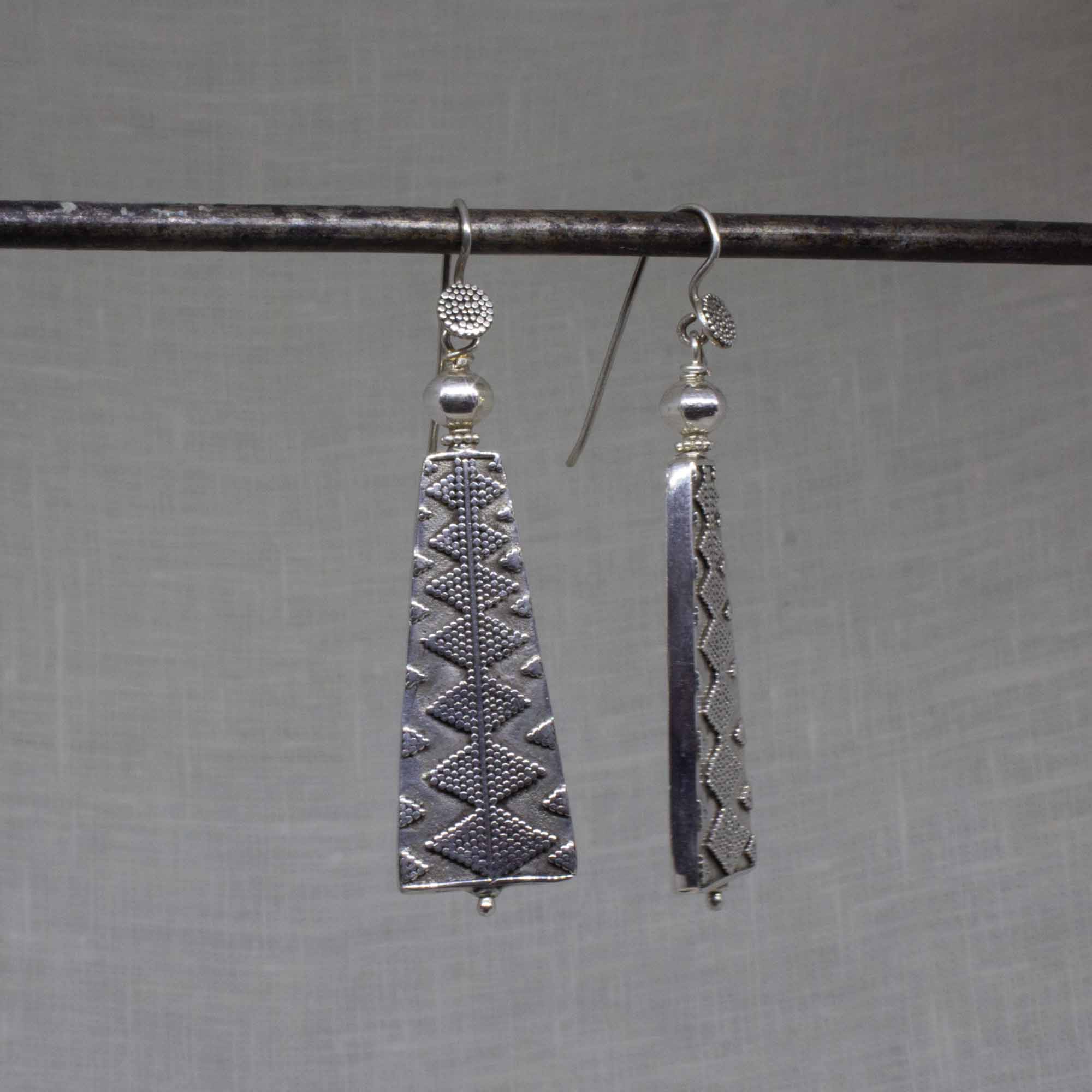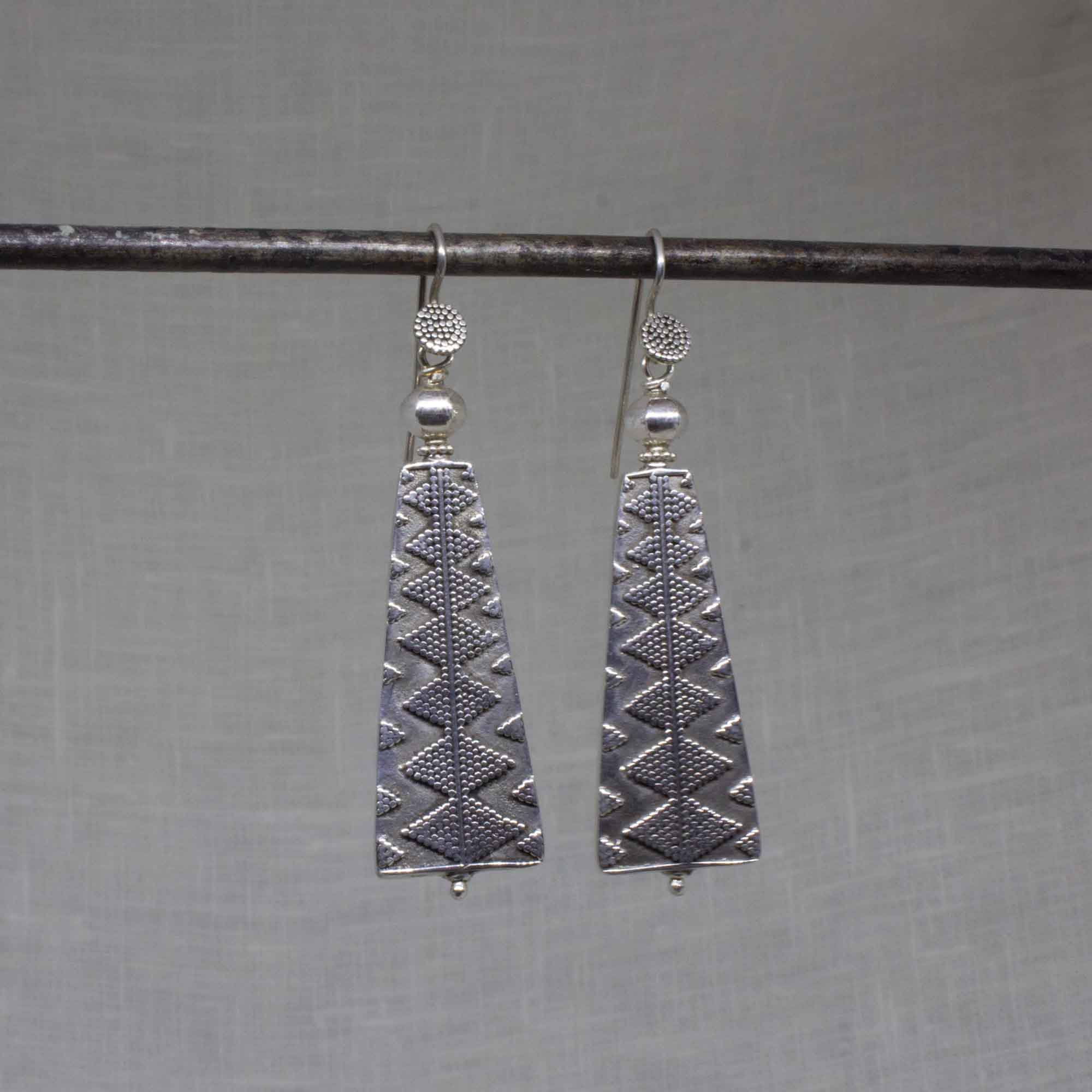 Striking long geometric drop earrings, handmade in sterling silver with triangular granulation work detail and a subtle oxidised finish. Hook fitting.