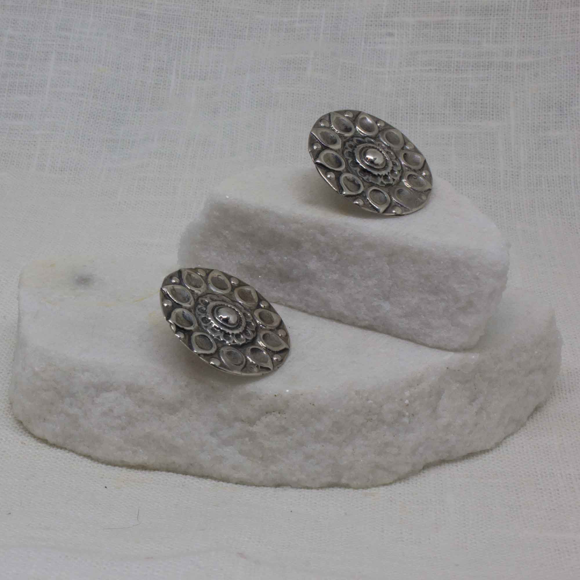 Round sterling silver disc stud earrings with handmade flower mandala detail.