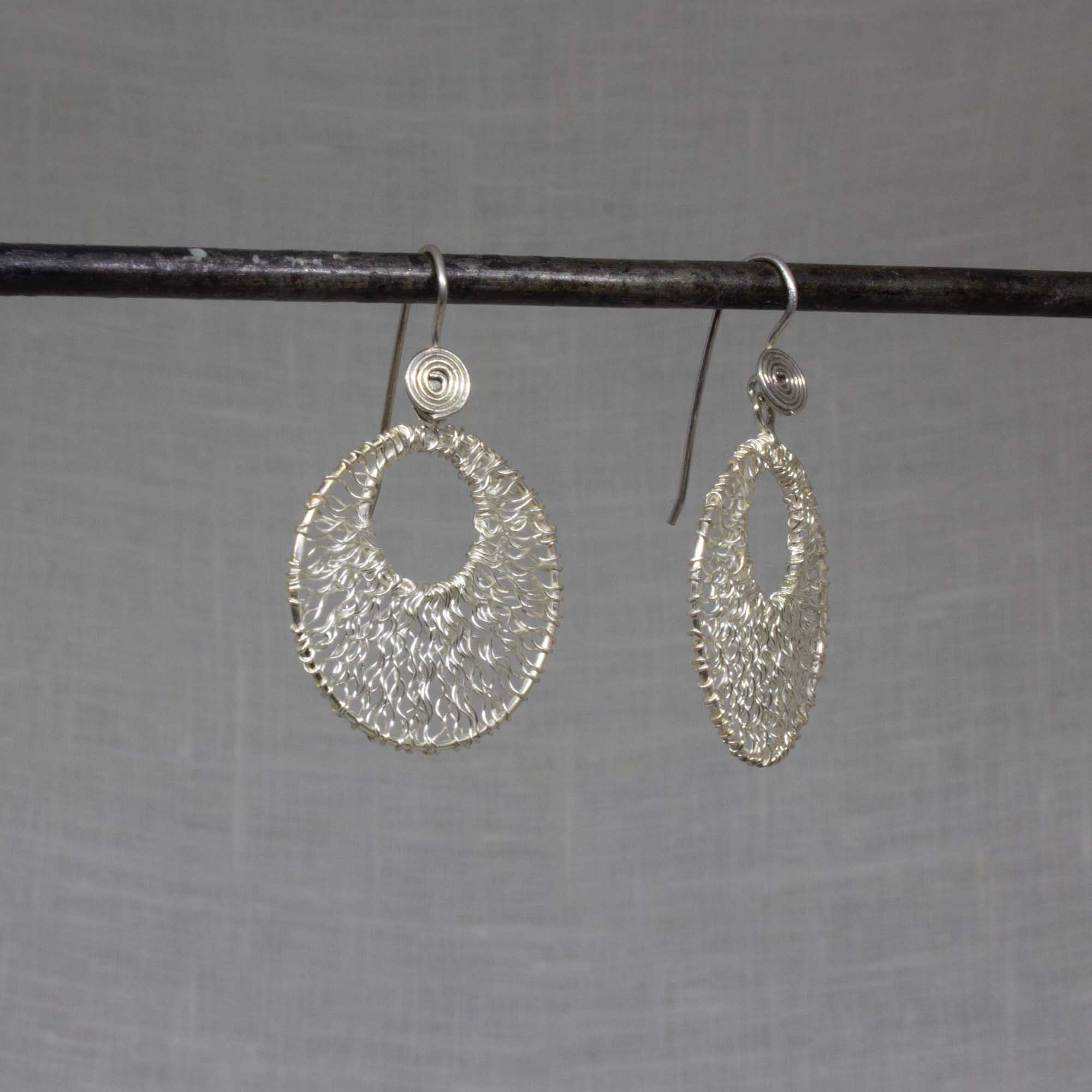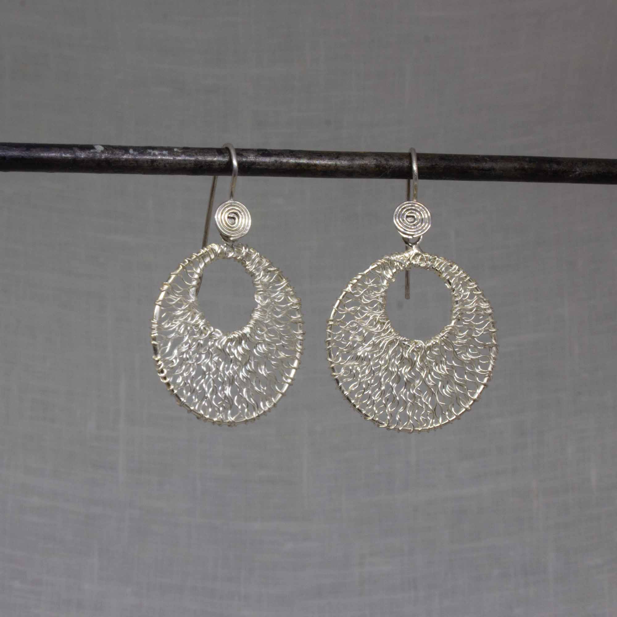 These open circle drop earrings are handmade in sterling silver with curved wirework detail and a simple hook fitting. Versatile dangle earrings that can be dressed up or down.