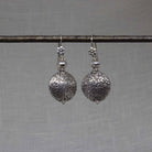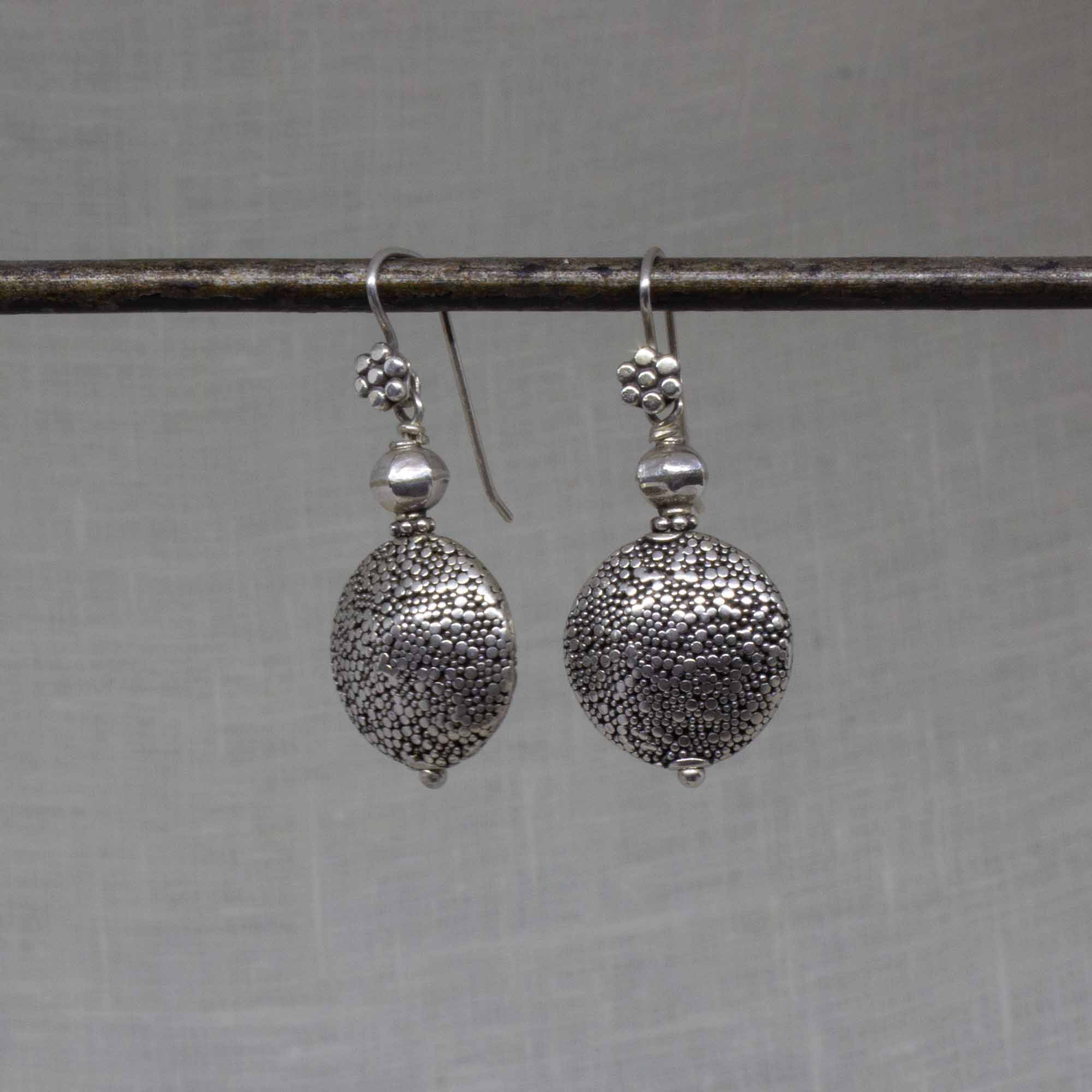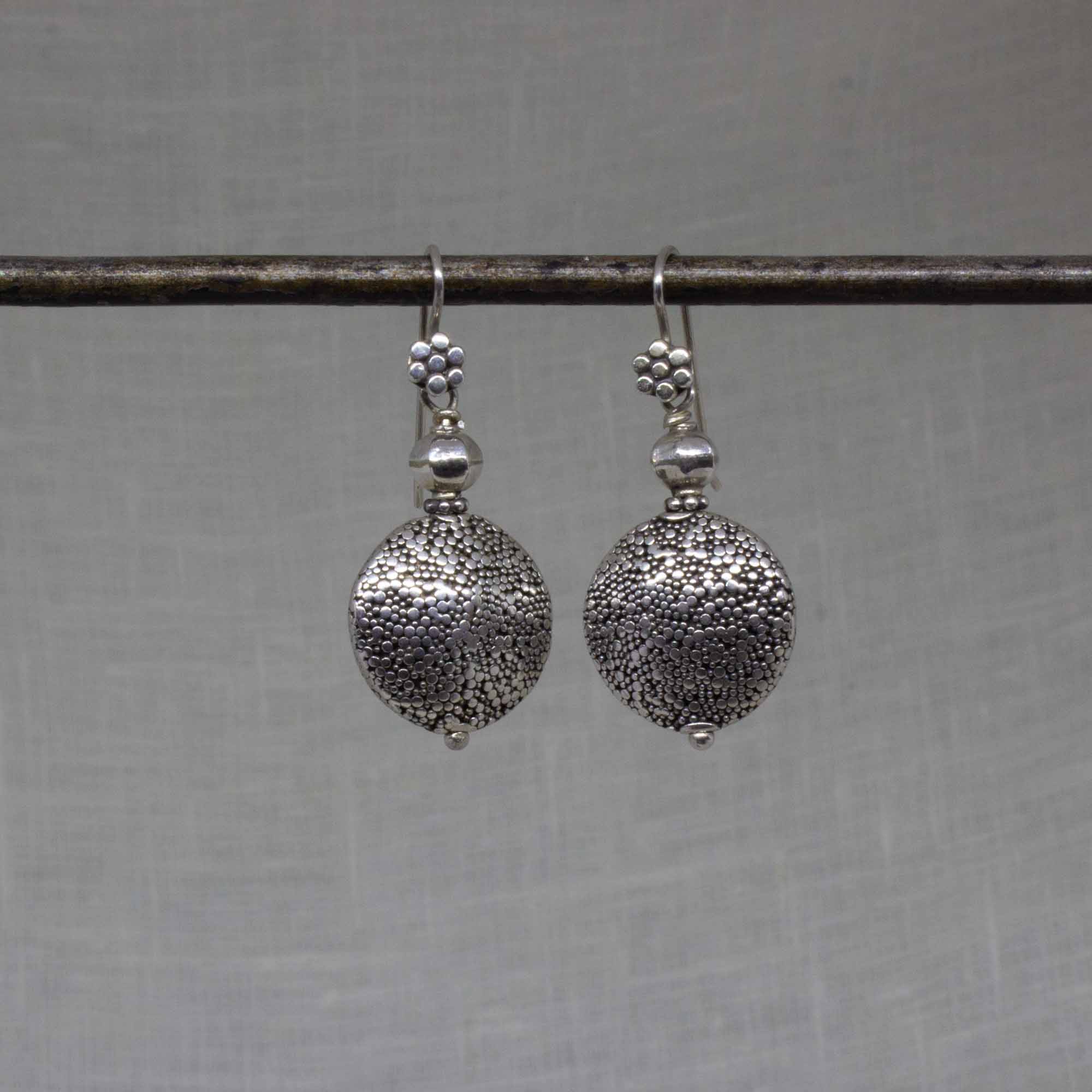 Round granulation drop earrings, handcrafted in sterling silver with lovely textured granulation detail and hook fittings. Stylish and understated.