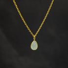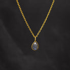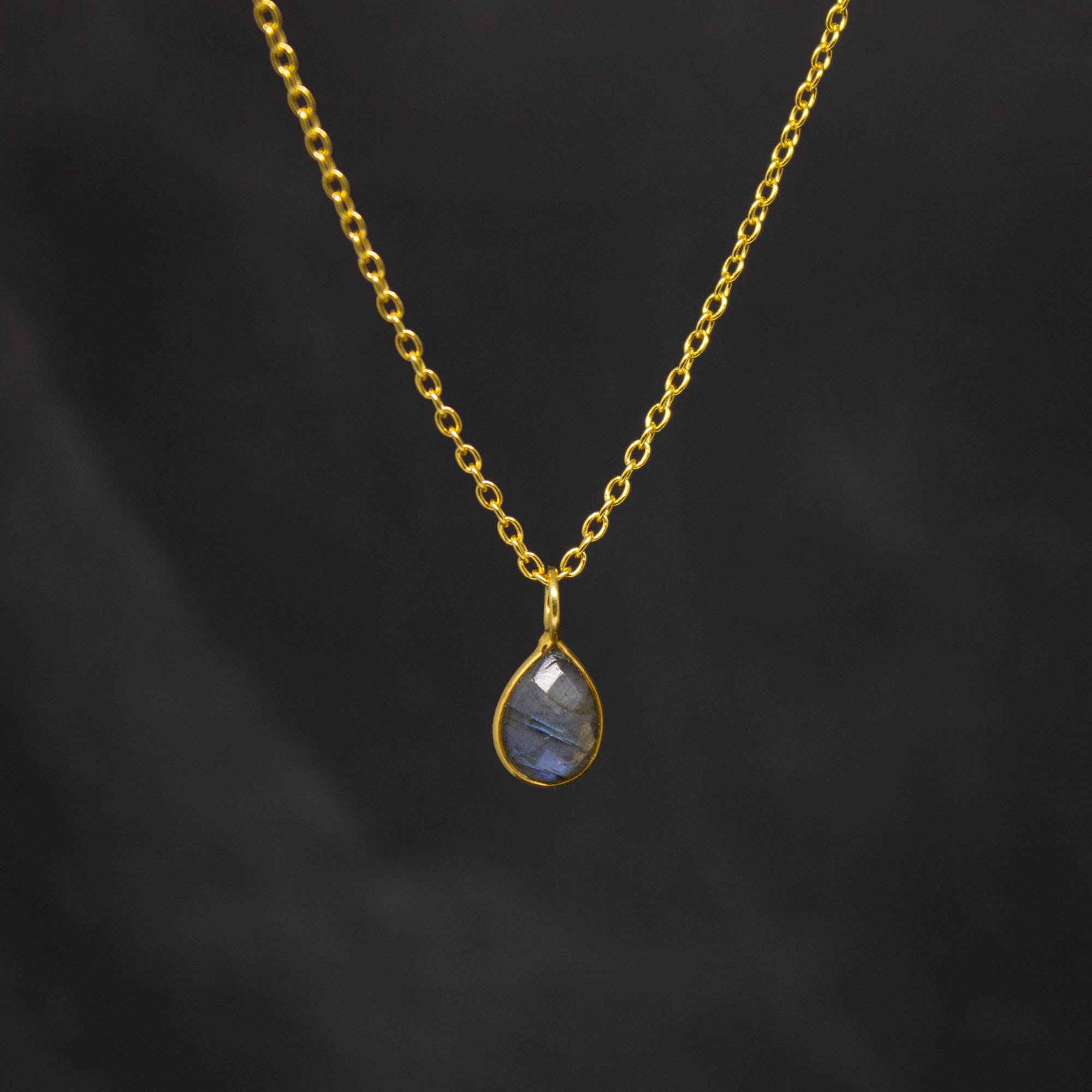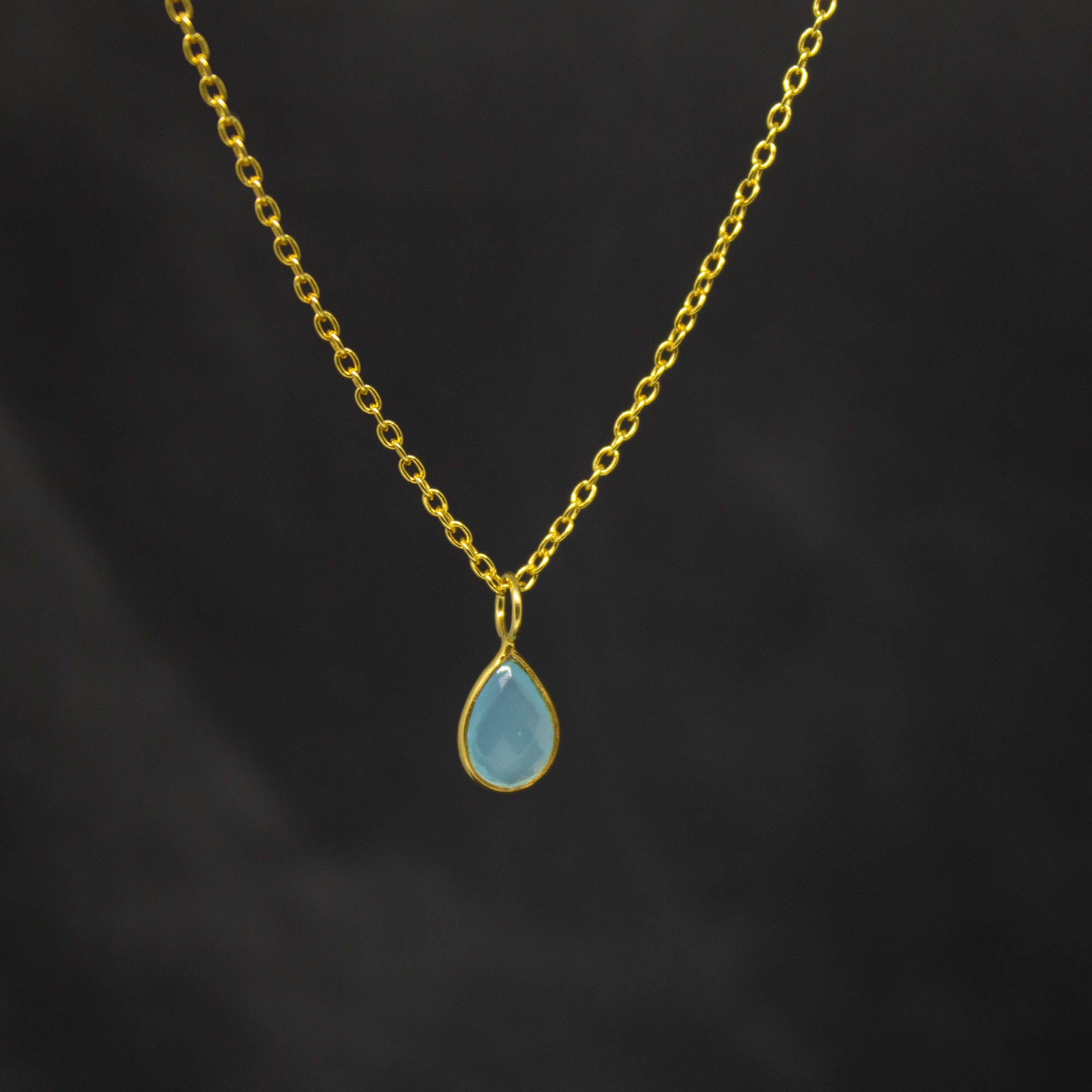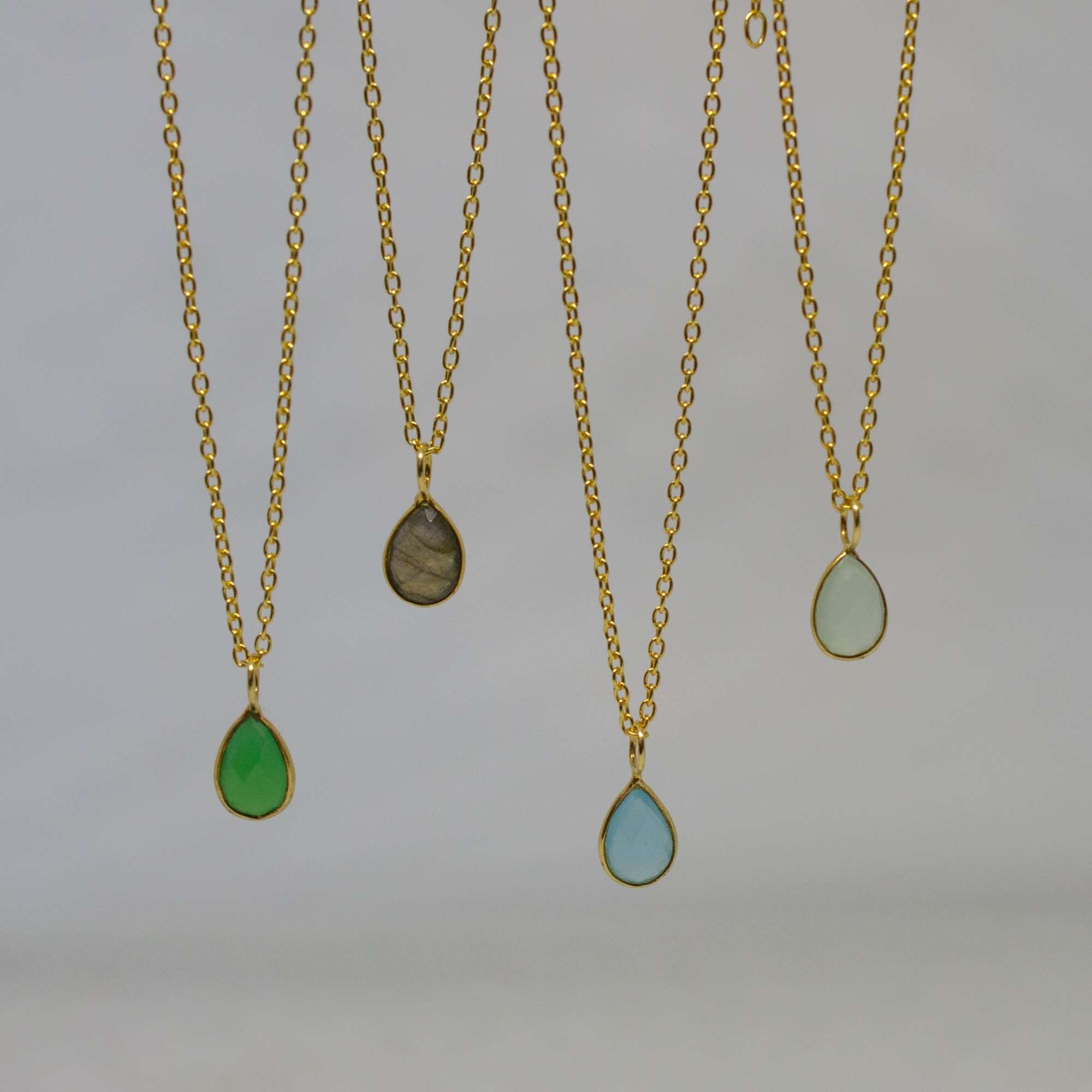 Beautiful teardrop shape gemstones - aqua chalcedony, blue chalcedony, chrysoprase or labradorite - set in a simple gold vermeil setting. The pendants hang on adjustable gold vermeil trace chains, which can be worn at 16", 17" or 18". Simple gemstone pendants - wear as a stand along piece or perfect for layering!
