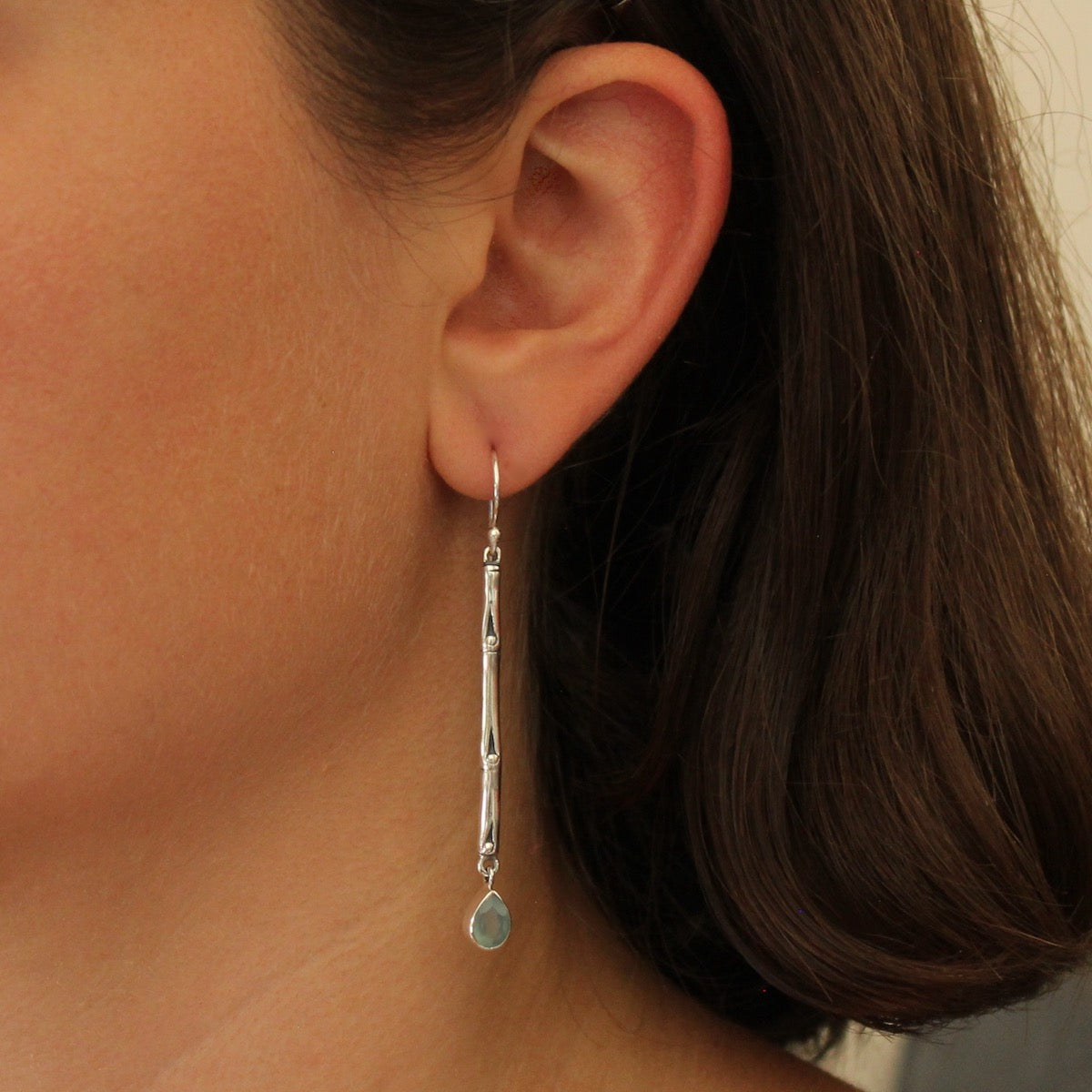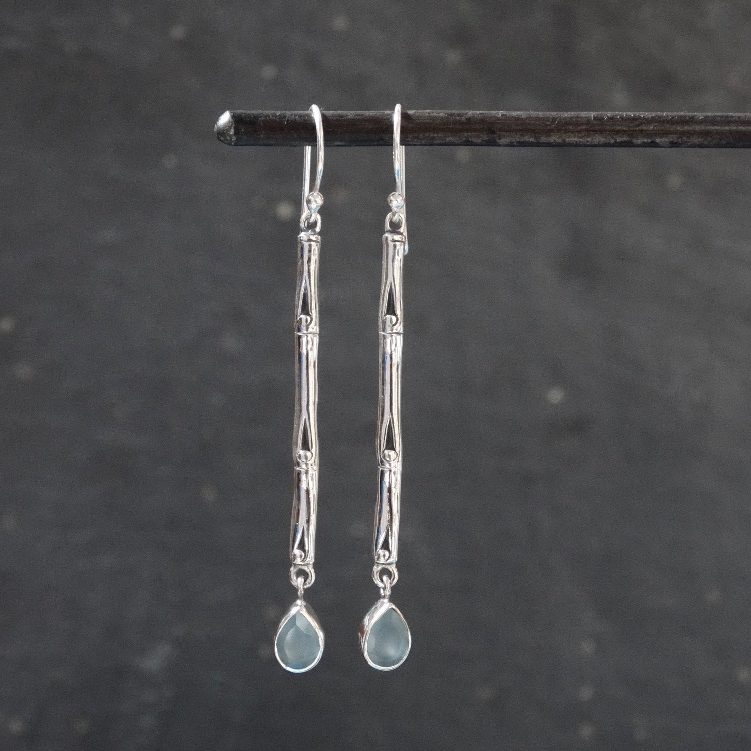 These long bamboo drop earrings are handmade in sterling silver with a teardrop faceted blue chalcedony gemstone and hook fitting.