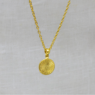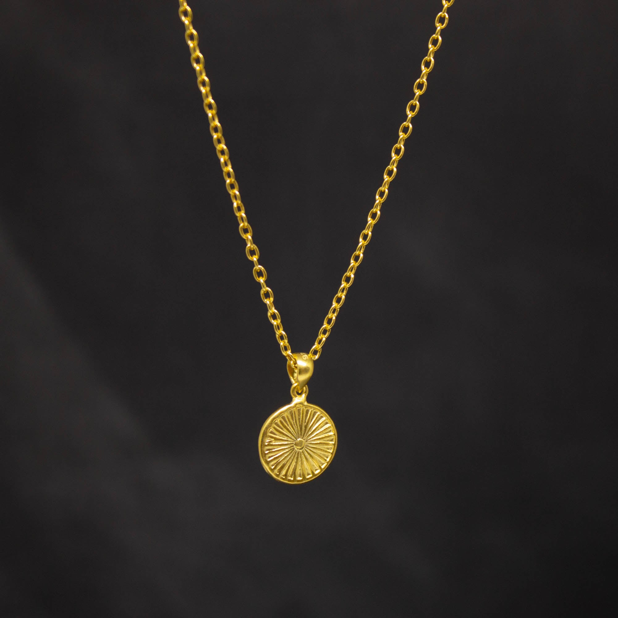 A small round 18k gold vermeil disc pendant with a textured sun design complete with an adjustable trace chain, 16 inches extendable to 18 inches.