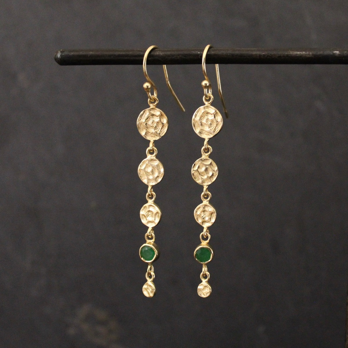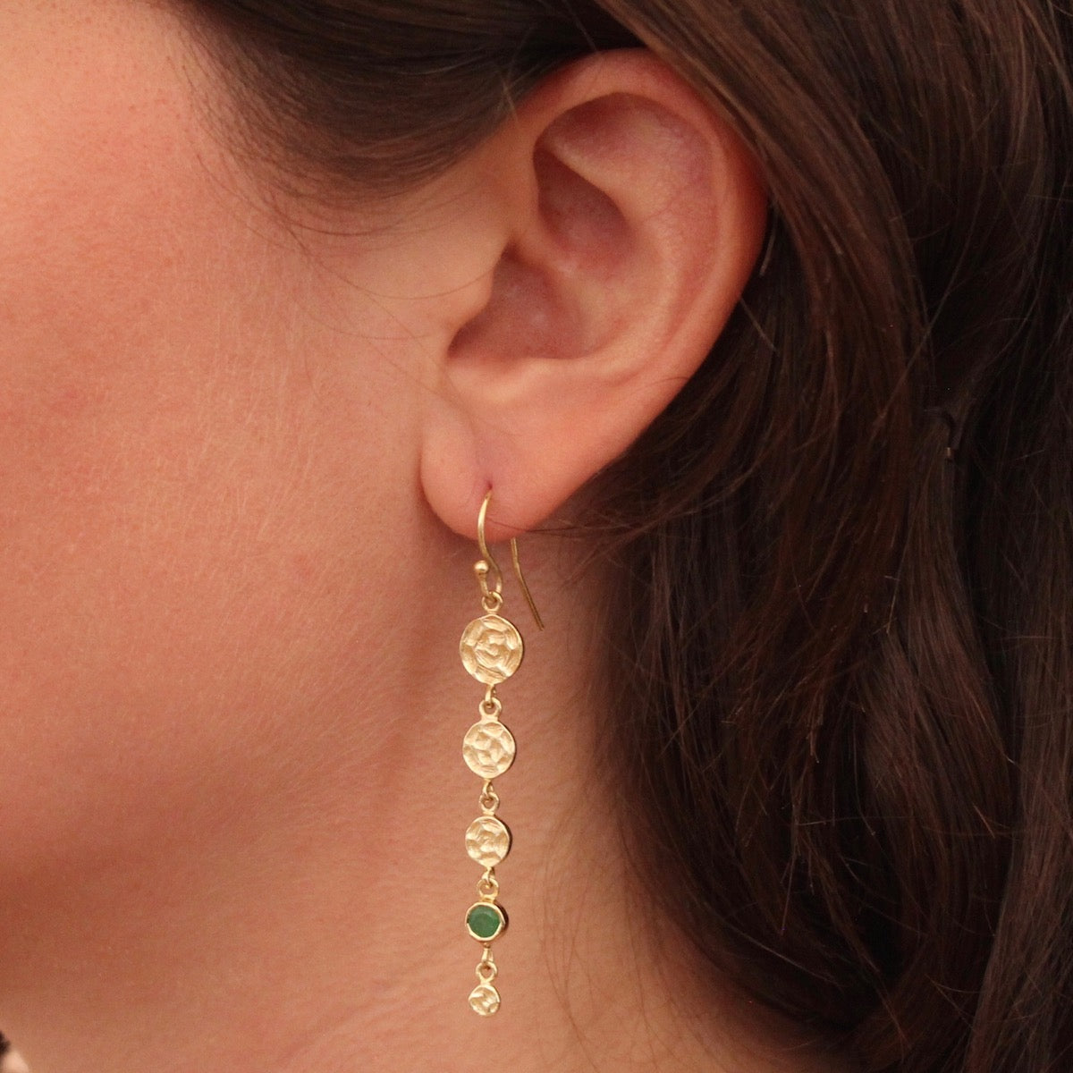 Hammered gold vermeil discs with faceted green onyx gemstones and a hook fitting.