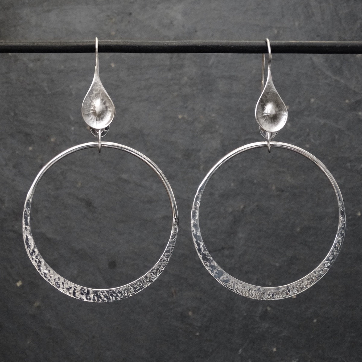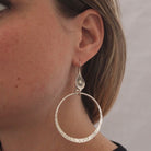 Make a statement with these sterling silver open circle drop earrings with hammered detail and a hook fitting.