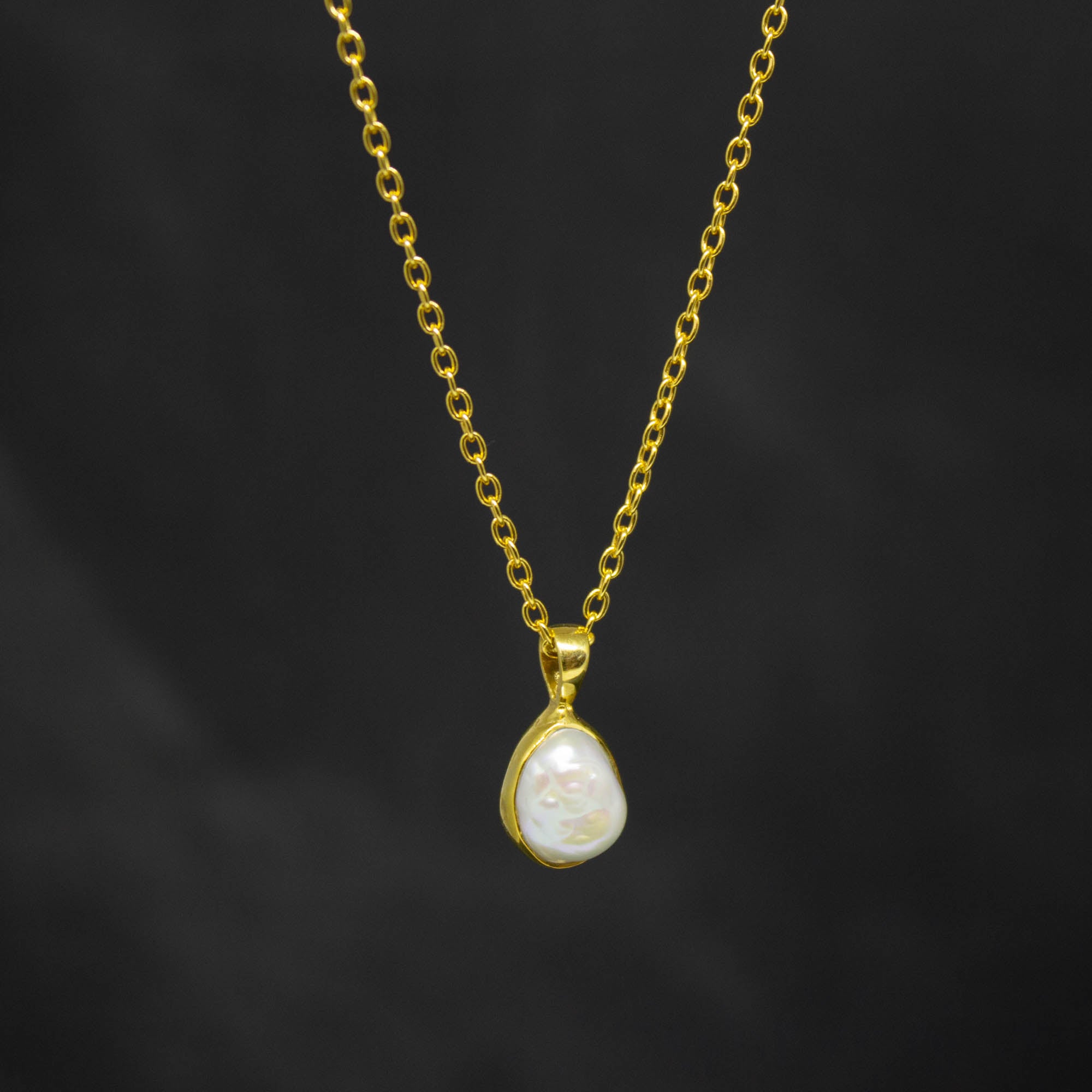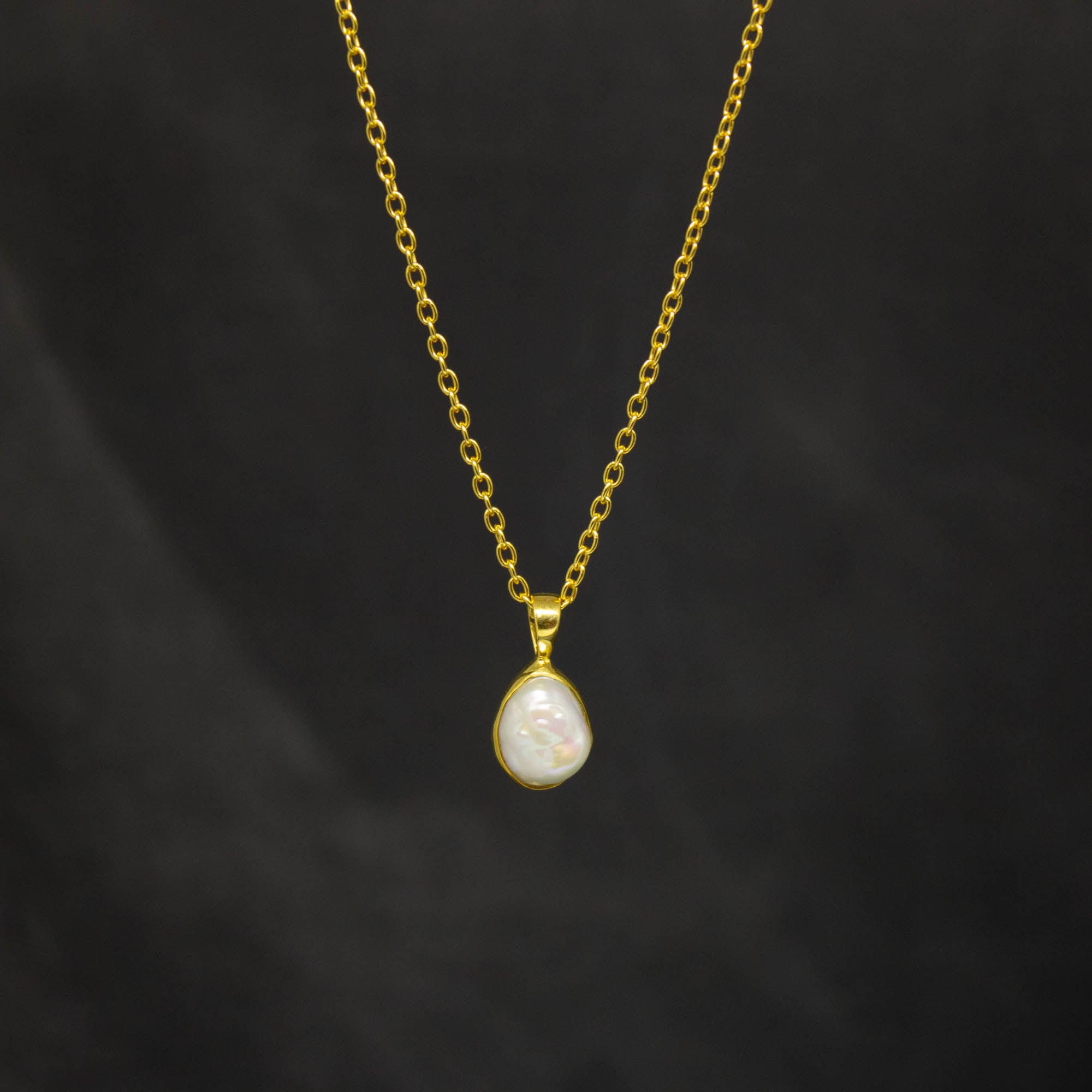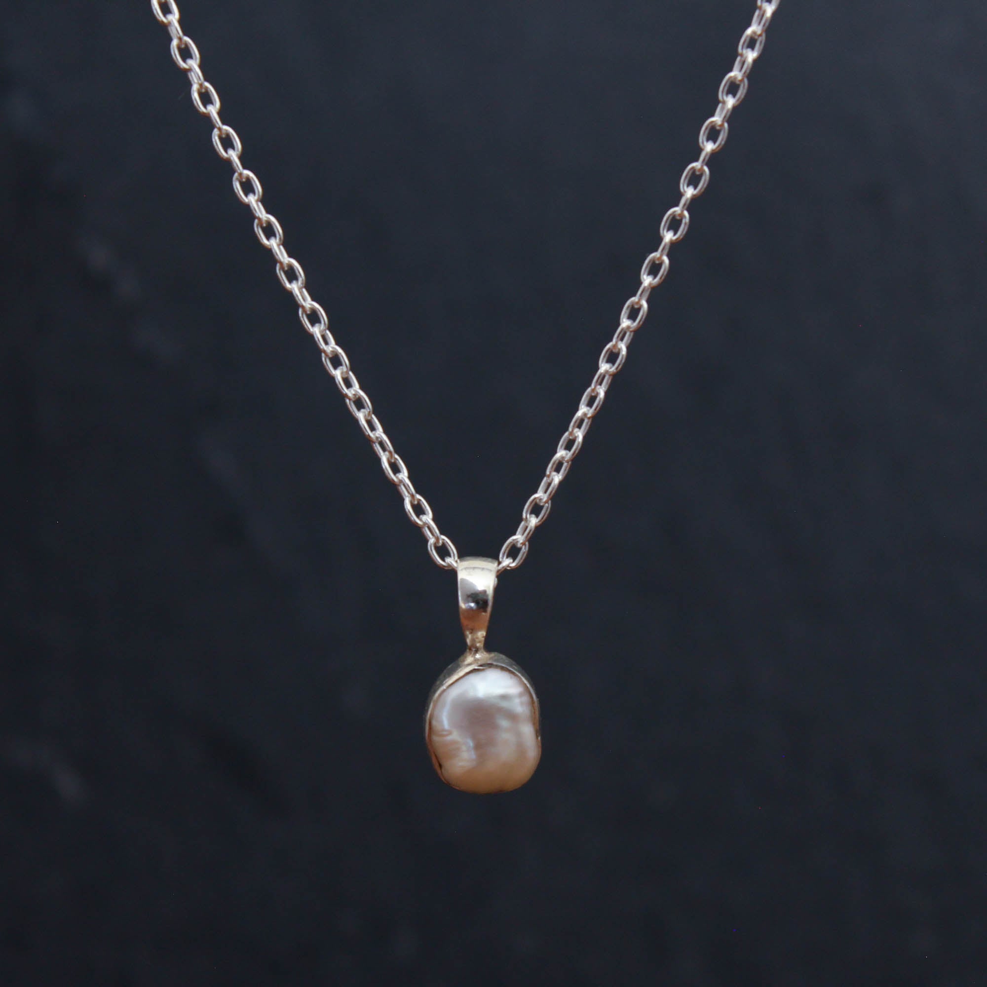 A beautiful irregular pearl in a simple sterling silver or 18k gold vermeil setting, complete with an adjustable trace chain, 16 inches extendable to 18 inches.