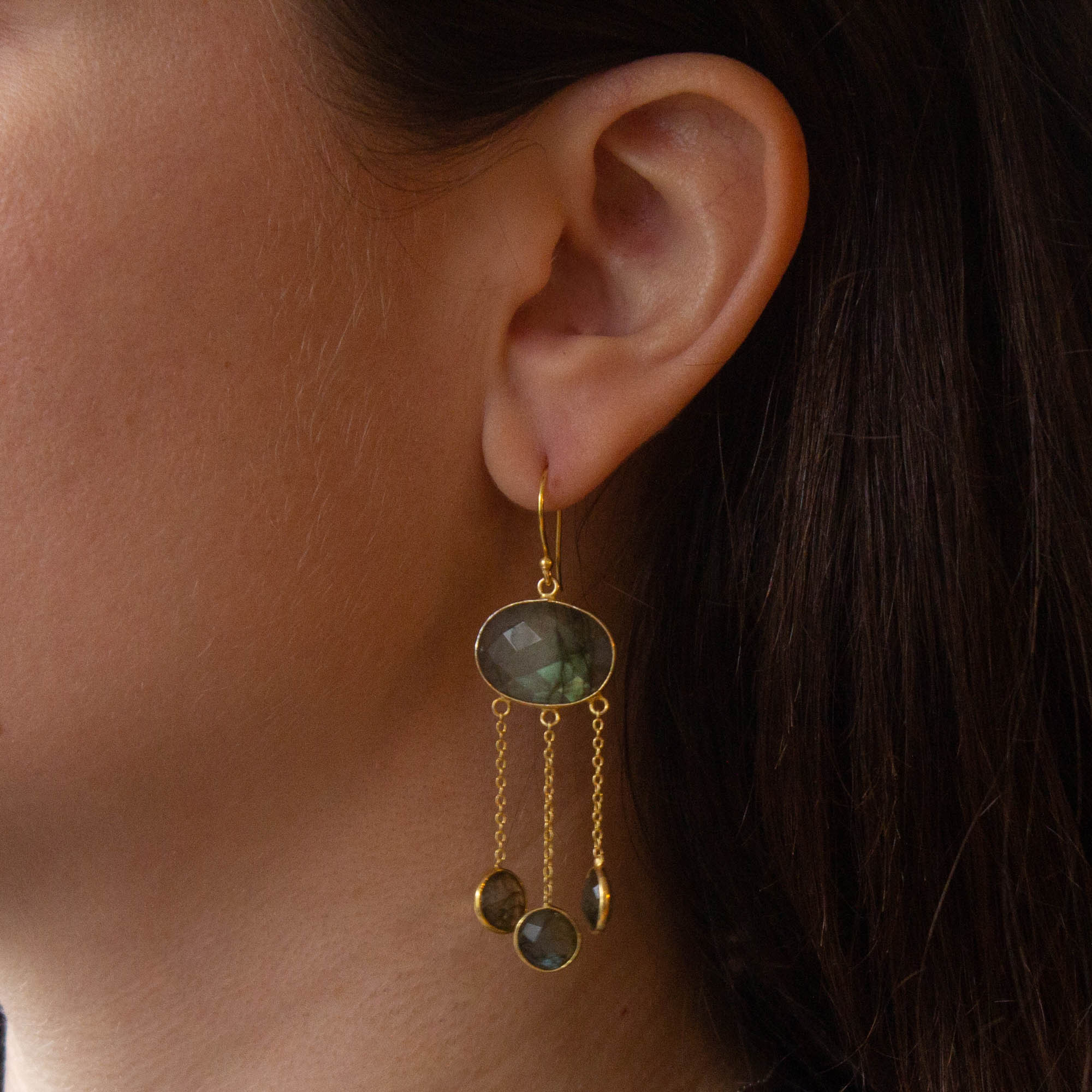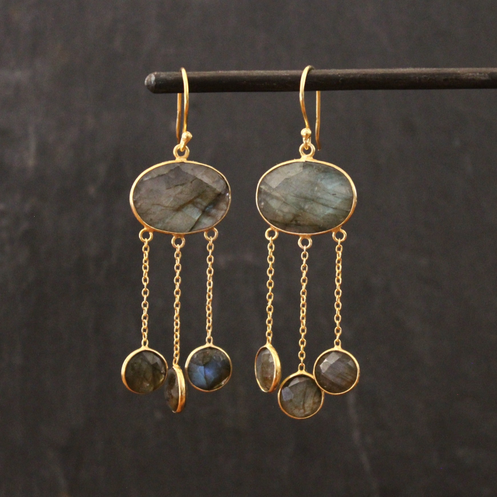 Gold vermeil and labradorite chandelier drop earrings. An oval faceted labradorite gemstone sits above three smaller, round labradorite stones on chain drops.