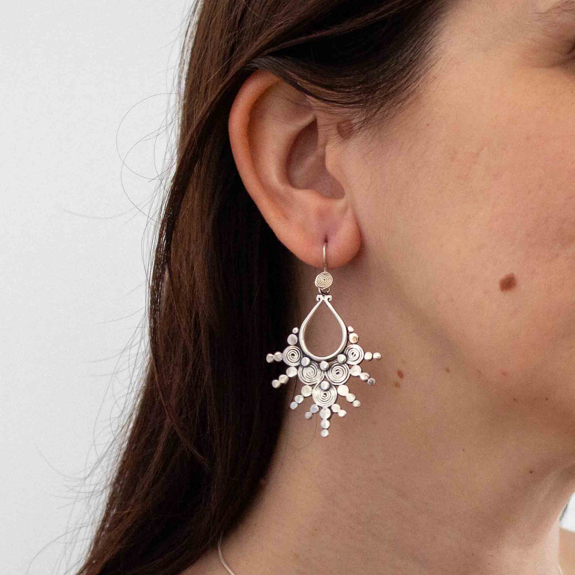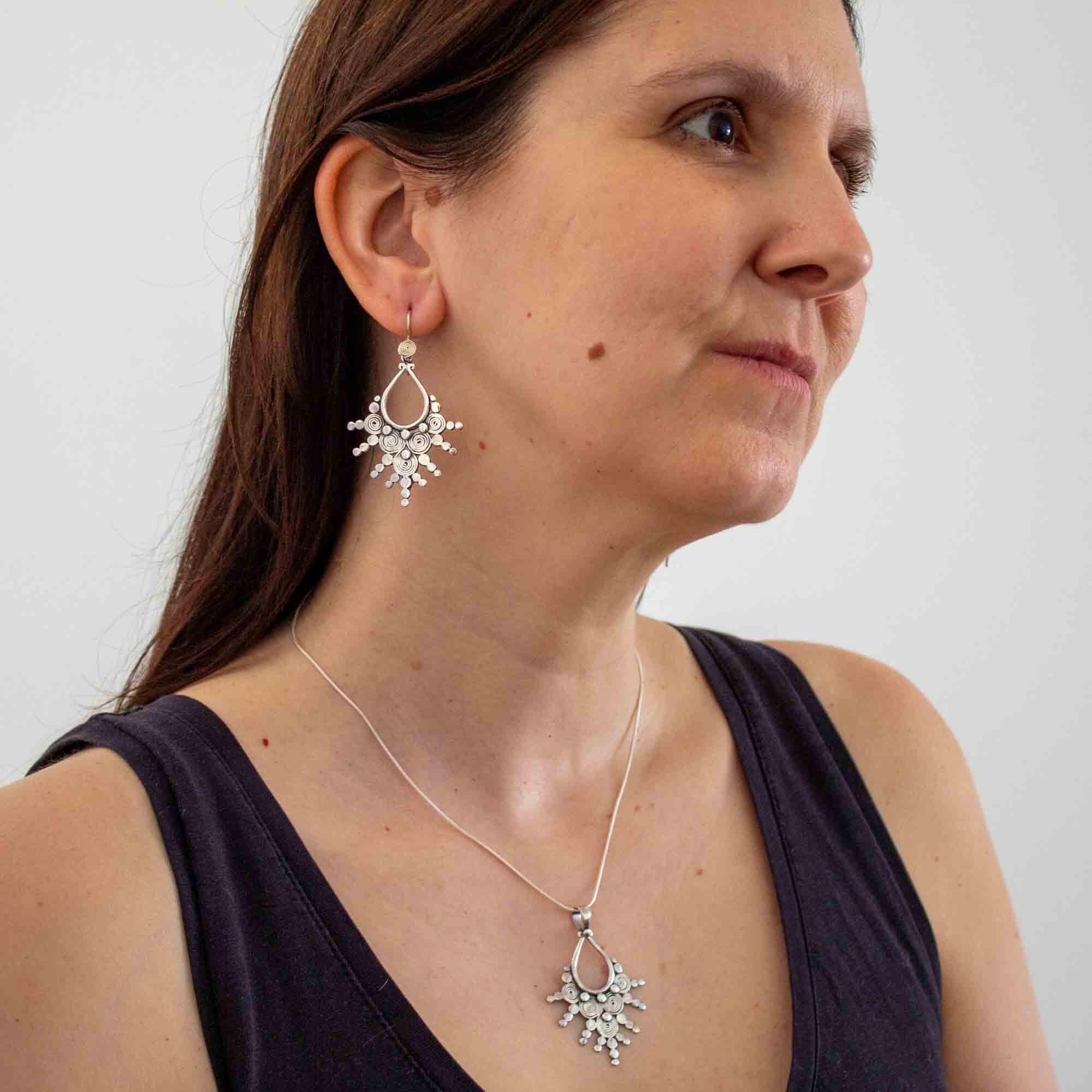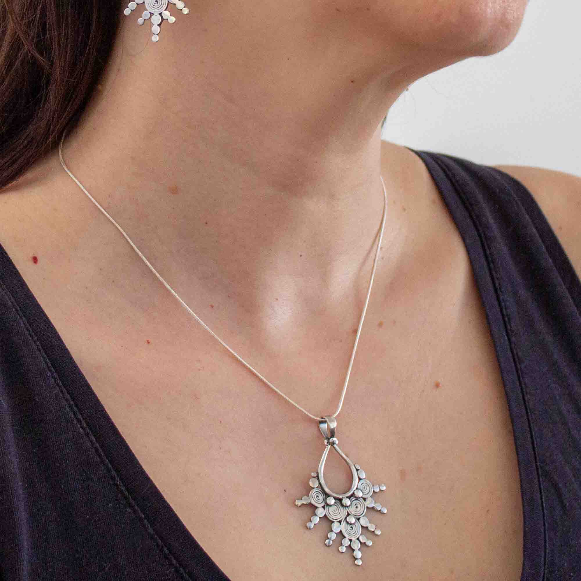A stunning sterling silver pendant with a teardrop centre and five spiral rays, which has been oxidised to give an antique finish.